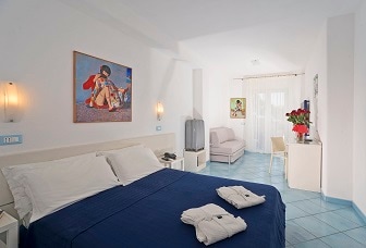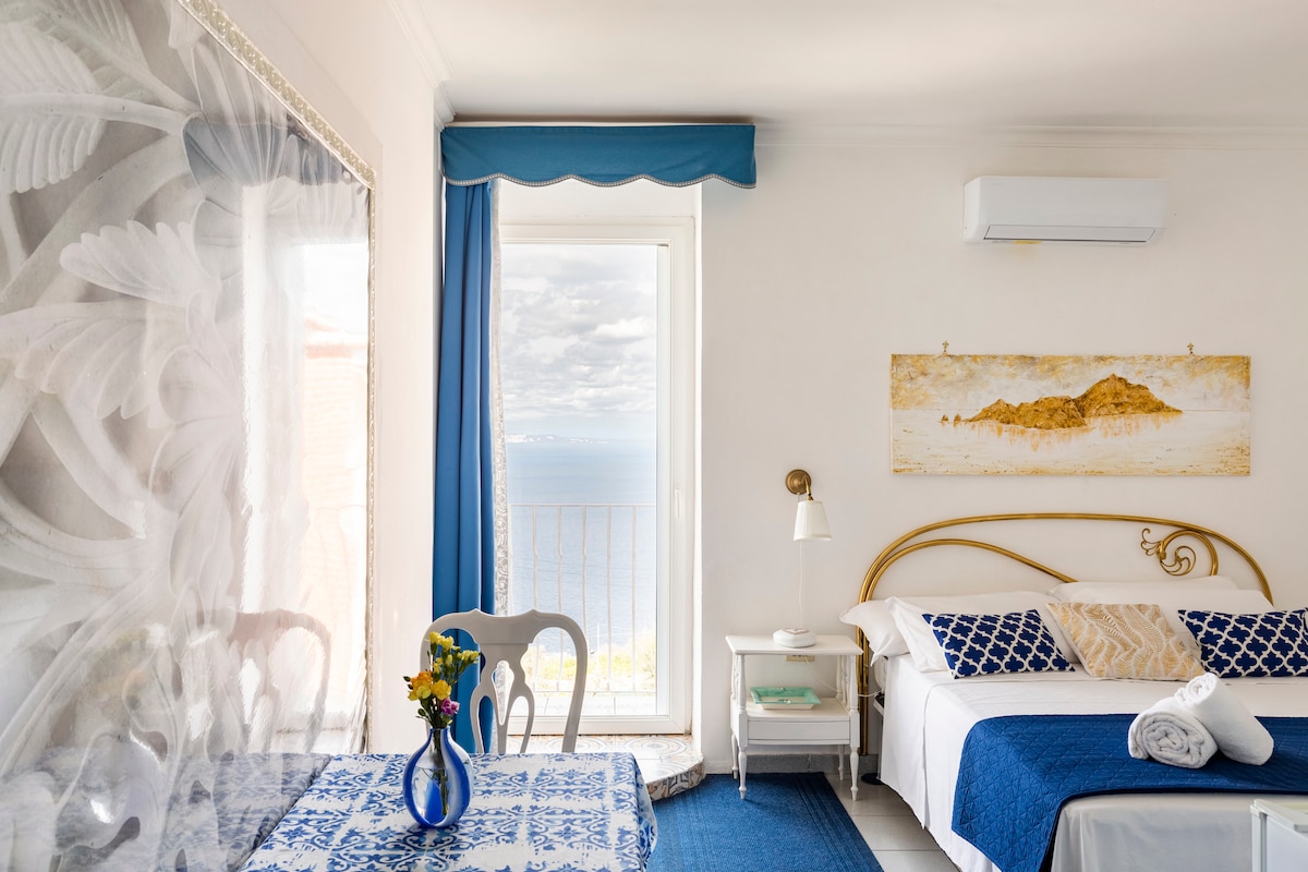 La camera, decorata con presepe napoletano artigianale, dispone di bagno in camera e balcone panoramico privato, con possibilità di letto matrimoniale o singolo.