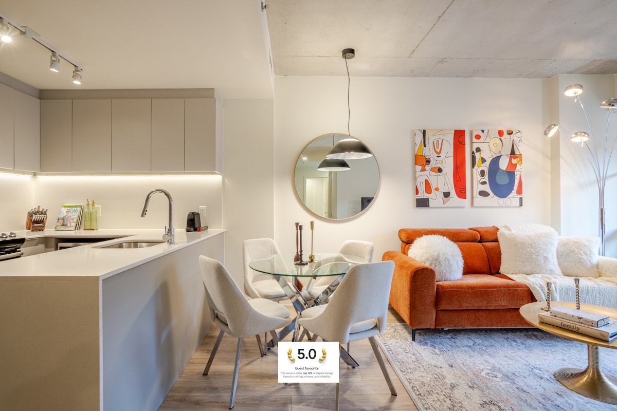 This bright, minimalist Scandinavian-style 3-bedroom apartment is perfect for groups of travelers. Set in a fully restored historic building, it’s just steps from the Museum of Fine Arts, Mont-Royal Park, and the Bell Centre, with fantastic dining and cultural spots nearby. Guy-Concordia Metro is less than 5 minutes away, making it easy to explore the city. The condo also offers a lounge and gym and free laundry. For larger groups, additional apartments are available.