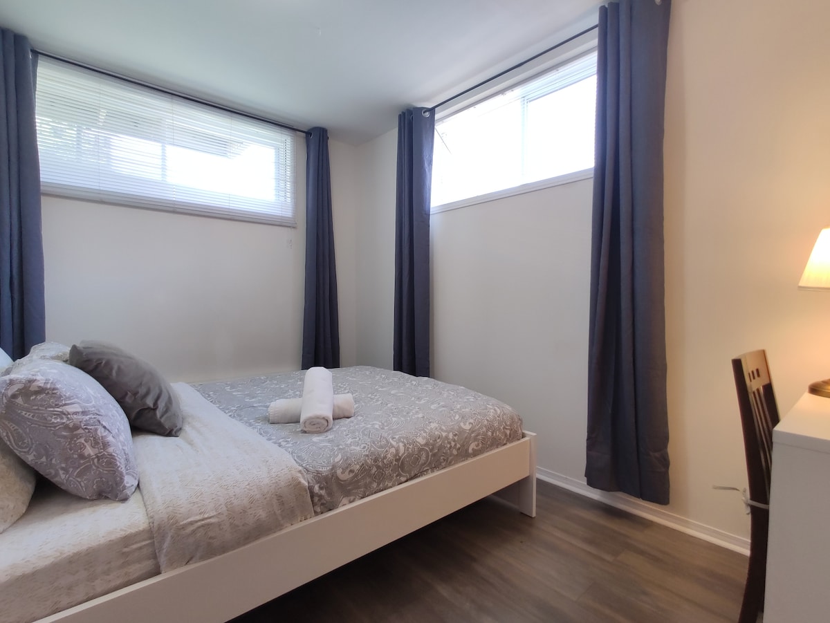 L'APPARTEMENT Grand 3 ½ au demi sous-sol d'un triplex, une grande chambre. WiFi illimité. Stationnement gratuit sur rue, même la nuit. Meublé ; frigo, four, laveuse-sécheuse, lave-vaisselle, smart TV, air conditionné, micro-onde, grille-pain, ustensiles, literie, séchoir. L'EMPLACEMENT Banlieu de Montréal. À 7 minutes d'auto du pont Jacques Cartier / pont Champlain / Métro Longueuil. Plusieurs lignes d'autobus à proximité : 4, 21, 54, 77 CITQ #312730