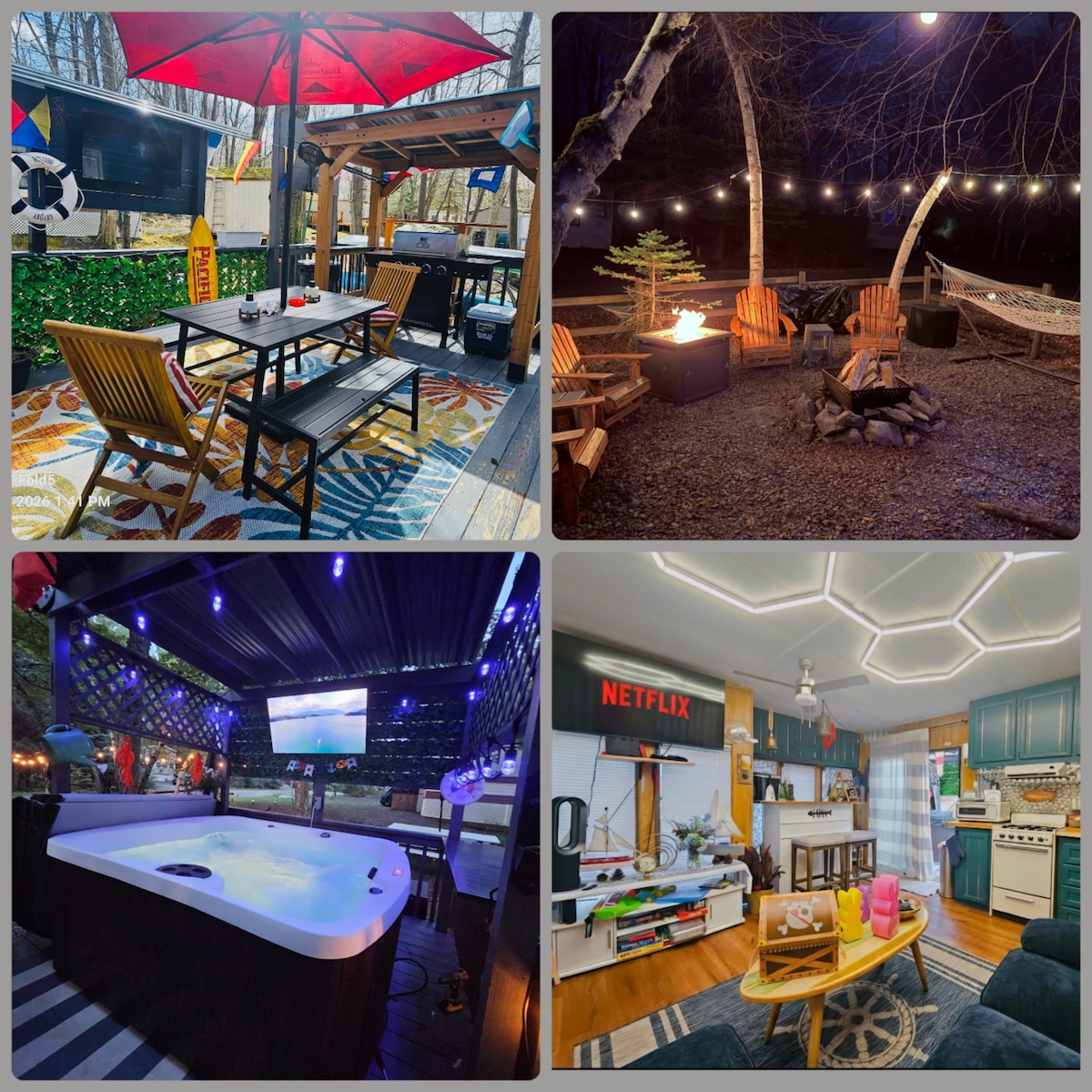 *Outdoor projector is here!* This spacious tiny retreat is fully stocked for a memorable family vacation or a romantic couple’s getaway. Soak in your private hot tub, toast s’mores by the fire, sway in the hammock under the stars, or stay in and enjoy hours of gaming on our new Nintendo Wii. Enjoy access to 2 beaches, an Olympic-sized pool (seasonal) mini golf, tennis courts & more. Just minutes from Pocono favorites like skiing, casinos, and waterparks.