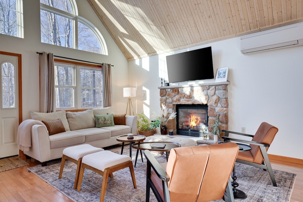 A stunning chalet ideally situated in the Pocono mountains. Your destination for a weekend escape or a longer stay all year round! Outside one can enjoy a natural setting in a beautiful 1-acre private wooded property, hot tub, two fire pits, a deck for morning coffee, or a delicious BBQ. Our home offers a tranquil interior atmosphere and home is conveniently located near all Pocono Mountains' seasonal activities. Whether you want to unwind or recharge, our home provides the perfect retreat.
