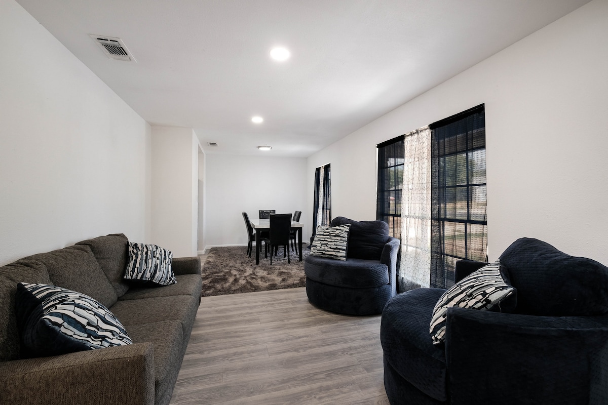 This elegant 3 bed 2 bath home is located in a peaceful, family friendly neighborhood. It is the perfect place to relax, celebrate, and make memories in San Antonio. Only 5 mins from Lackland AFB BMT, and easy highway access to everything great about San Antonio: 12 mins from SeaWorld, 20 mins from Six Flags Fiesta Texas, 18 mins from Riverwalk, Alamo, Botanical Garden and all downtown attractions. Additionally, extremely close to Walmart and HEB for groceries. You will feel at home!