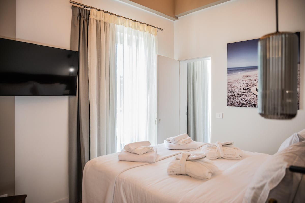 The Executive Suite comes with an independent entrance and two separate spaces, one of them being the comfortable bedroom with a double-size bed, and the other the cosy living room with a sofa-bed perfect for one more guest. The suite exudes a laid-back, warm and earthy atmosphere with modern decoration, perfectly complemented with a state-of-the-art bathroom and a kitchen area that has a small refrigerator. The suite is located on the 1st floor and can accommodate up to 3 guests.