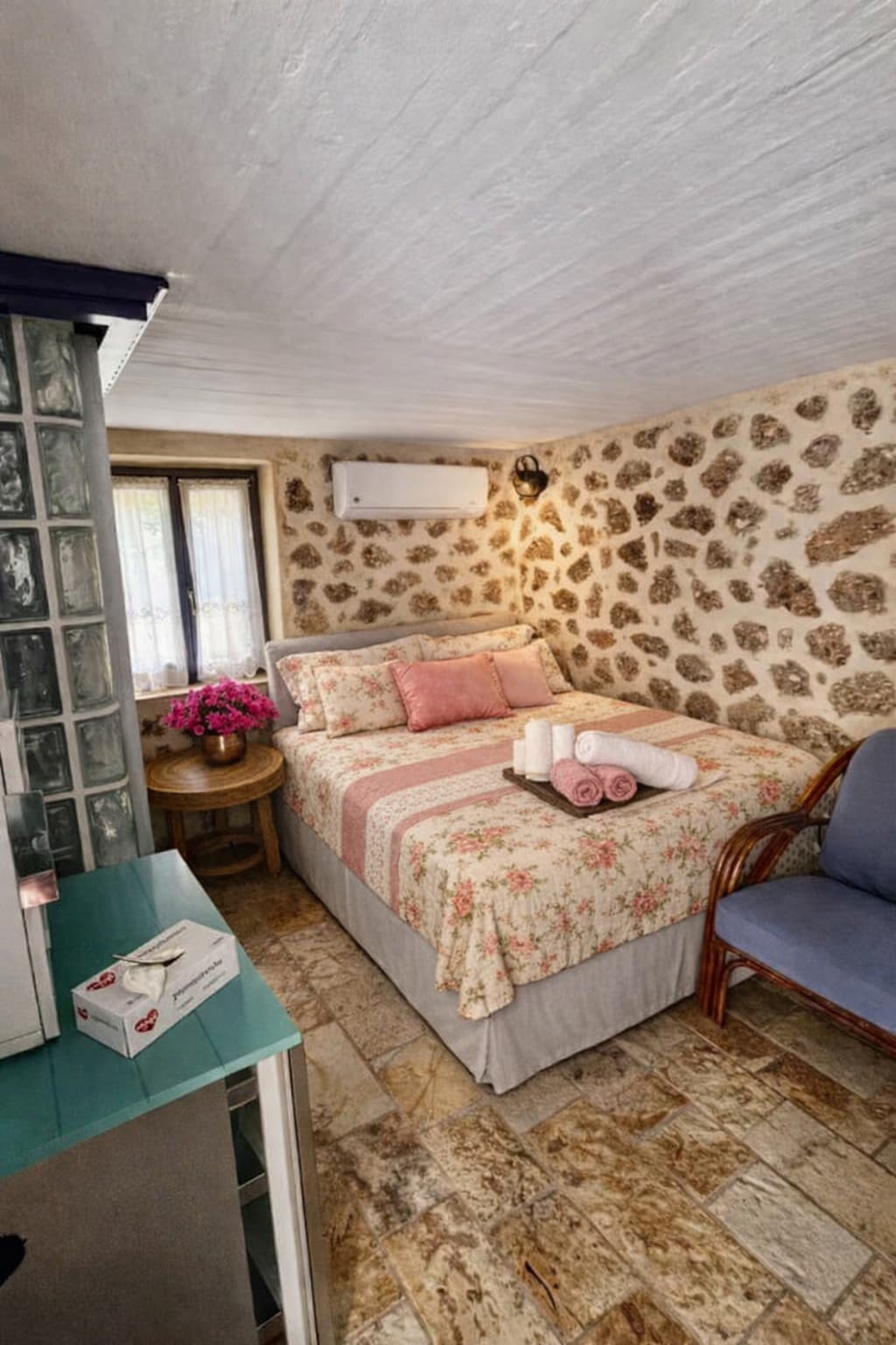 Charming and quiet accommodation in the annexe of our 200 year old traditional Kythirian home situated in the village of Friligkianika. The Manger room is part of the converted old stables where the 'local' donkey and goats were kept and still maintains the original feeding manger.