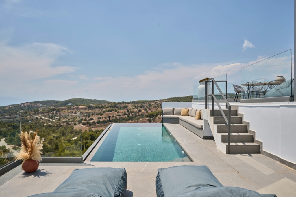 On the hills of the area Verga in Kalamata, Greece you will find villa Landmark, an ideal place to spend your holiday. 5 double bedrooms with a panoramic view and 4 fully equipped bathrooms. A large spacious living and dining room accompanied by a fully equipped kitchen. There is a gym along with the sauna room. From the large pool and the garden you can relax with the views of the never ending blue sea and the landscape of the Messinian bay.