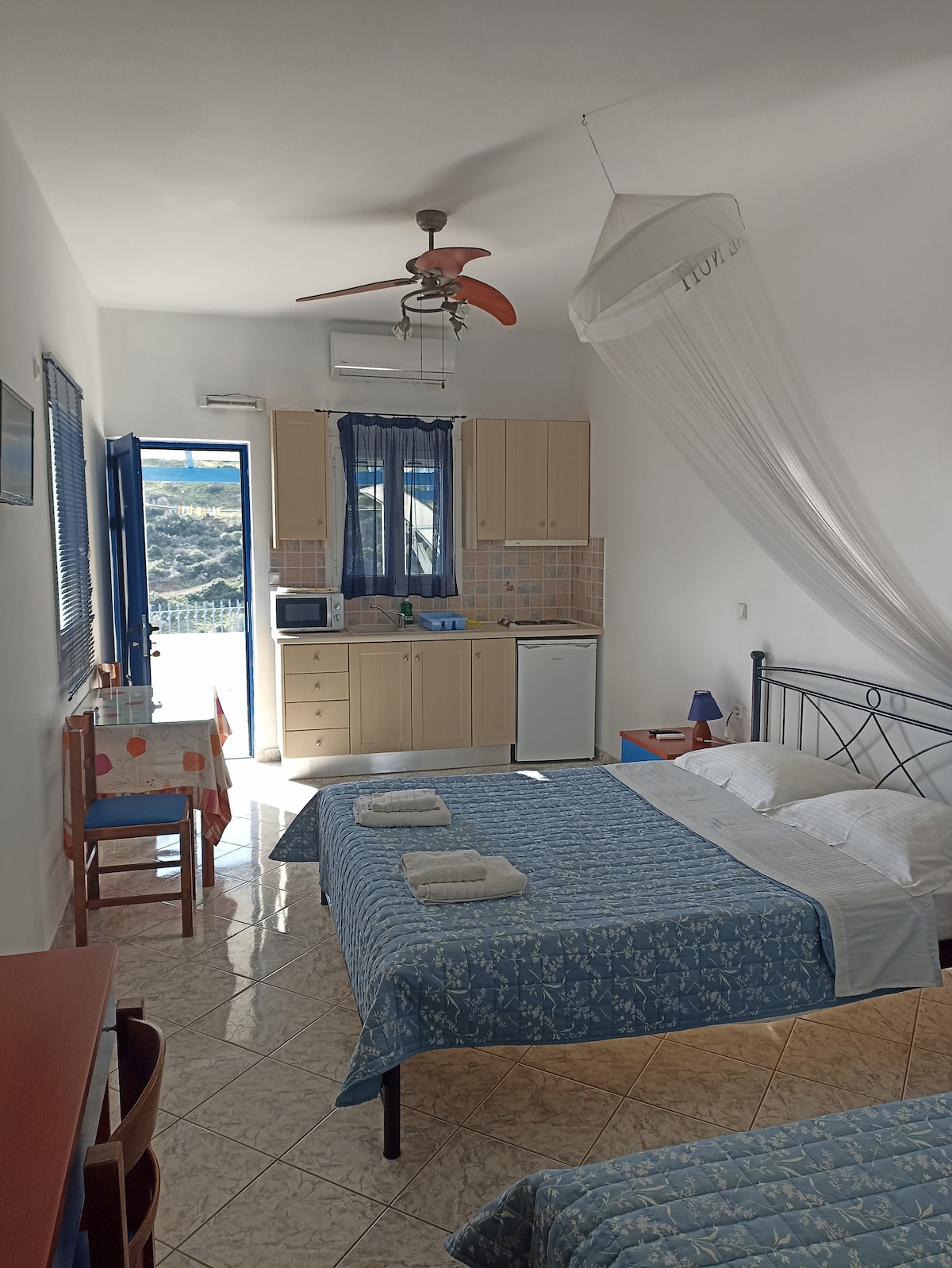 Δίκλινο δωμάτιο, πλήρως ανακαινισμένο, με ένα (1) διπλό κρεβάτι, tv 32'' και ιδιωτικό WC. Βεράντα με υπέροχη θέα στον Λακωνικό Κόλπο.