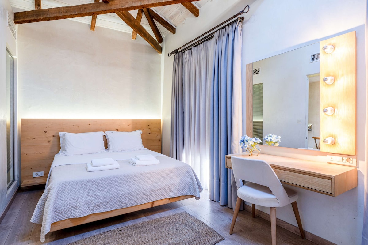 According to our philosophy, materials from nature have been used to match Mani's environment. Cozy suite with double comfortable bed, elevated bathroom and comfortable bed to relax on your vacation