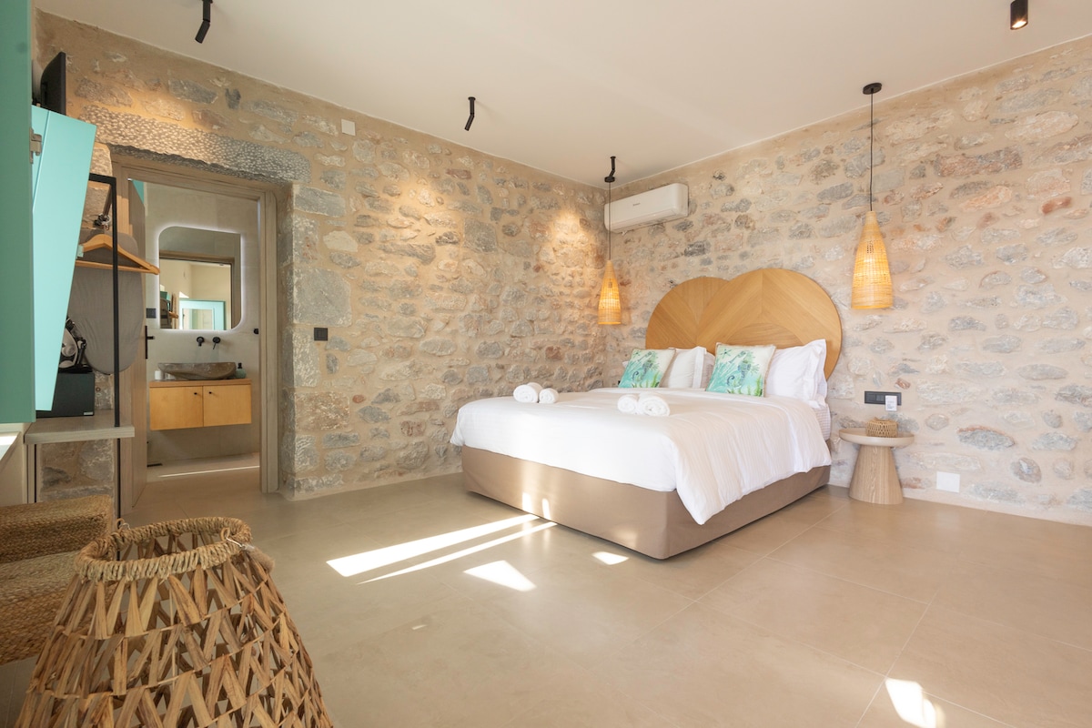 Αυτός ο μοναδικός χώρος έχει το δικό του στιλ. Στολισμένο με πέτρα και ξύλο σας χαρίζουν στιγμές αρμονίας και χαλάρωσης, εξοπλισμένο με όλα τα εφόδια για να απολαμβάνετε τις διακοπές σας! Απέραντη θέα στη θάλασσα και στο βουνό, με γαλαζοπράσινα νερά μπροστά στα πόδια σας, το μόνο που μένει είναι να κατεβείτε μερικά σκαλοπάτια! Για περισσότερη απόλαυση έχουμε εξοπλίσει το δωμάτιο με υδρομασάζ! Είμαστε σίγουροι οτι θα το απολαύσετε!!