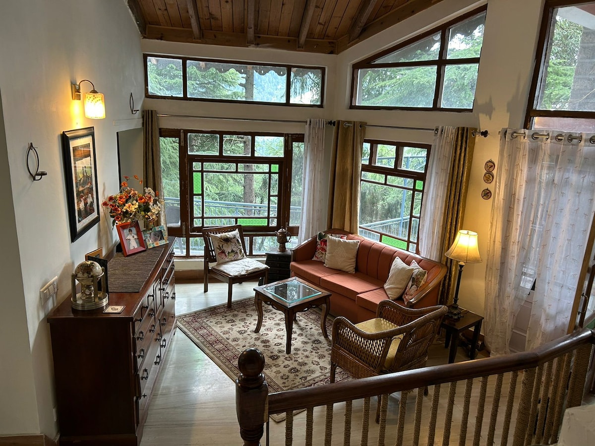 This Tiny house inspired studio, housed within a Victorian chalet, with its independent entryway and a private tiny lawn is sure to enthrall you. Be it the trending WFH requirements or freelancers on the move this place has been designed to cater for all. Furnished in cedar wood and whites, the studio reflecting eloquent modernity also preserves the typical mountain house elements. let yourself experience " House in a Room"