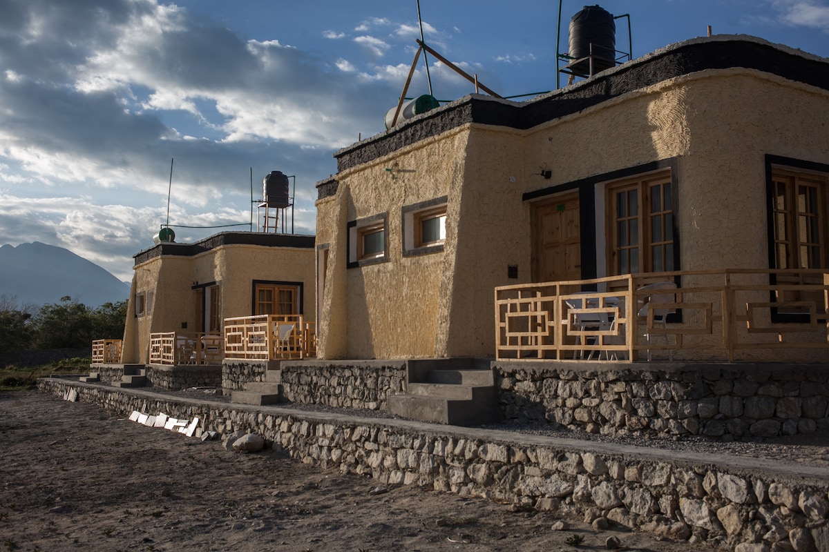 A spacious farmstay in a serene and quiet location with attached parking, just 1.5 km from Mall Road. Our garden features apricot and willow trees, with friendly pets playing around. Enjoy the sunrise from the comfort of your bed, along with panoramic views of the Leh ranges. We have ladakhi style newly built room sparkling clean attached washrooms.