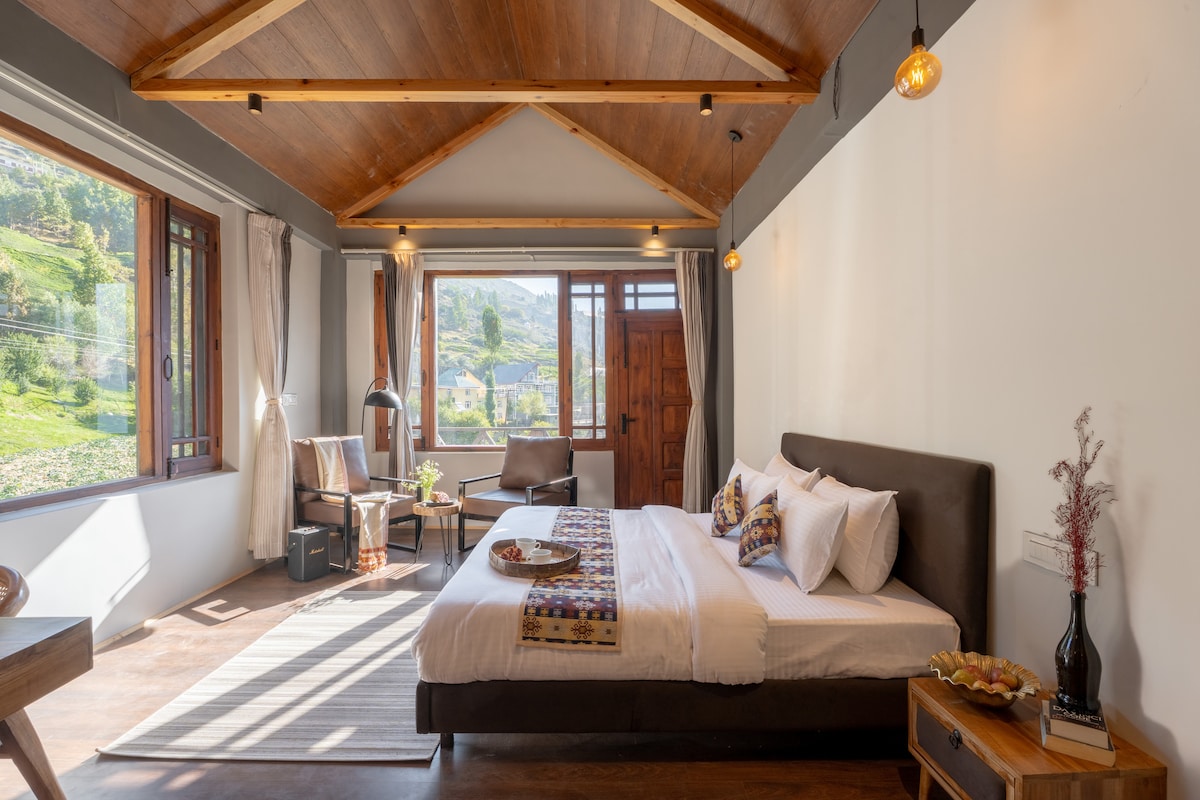 This Tiny house inspired studio, housed within a Victorian chalet, with its independent entryway and a private tiny lawn is sure to enthrall you. Be it the trending WFH requirements or freelancers on the move this place has been designed to cater for all. Furnished in cedar wood and whites, the studio reflecting eloquent modernity also preserves the typical mountain house elements. let yourself experience " House in a Room"