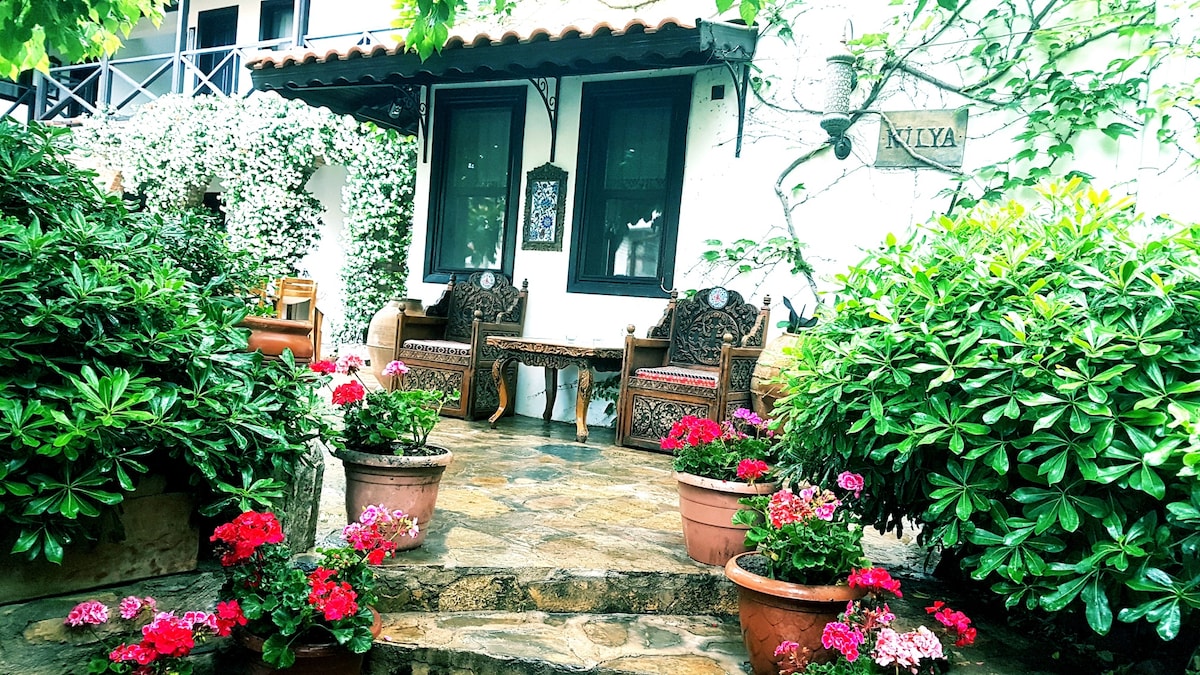 This unique hideaway is Alice Pansiyon. It is surrounded by a lovely garden with many trees and local flowers. Each room has its own private entrance and a full marble bathroom, as well as a spacious sitting area and vintage wardrobe. Our many wi-fi antennae provide strong connections in the rooms as well as the common area. The common area is a beautiful cottage with a solid wood ceiling and full kitchen. In the summer you can enjoy your Turkish coffee or breakfast on the patio.