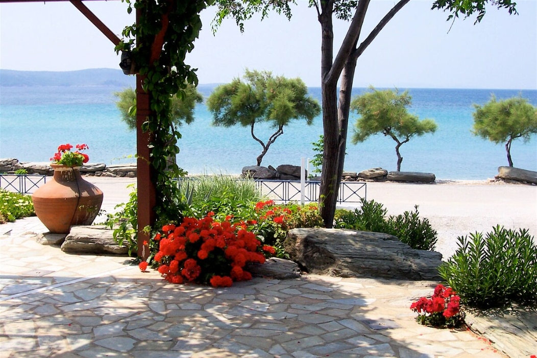 Attached Summer House,3 bedrooms,2 bathrooms,2 patios.Enclosed area with restricted access(160 houses in total,always calm,not crowded by the sea or by the pool.Security,private bay,easy access to public transport,3km from the central. Common areas only for residents:Pool(opens in June, closes in September),seaside swimming/sunbathing,private bay,tennis,football,basketball,table tennis,playground,small grocery,5-7mins walk from public beach,free parking,barbeque,air conditioning(All rooms).Wifi.