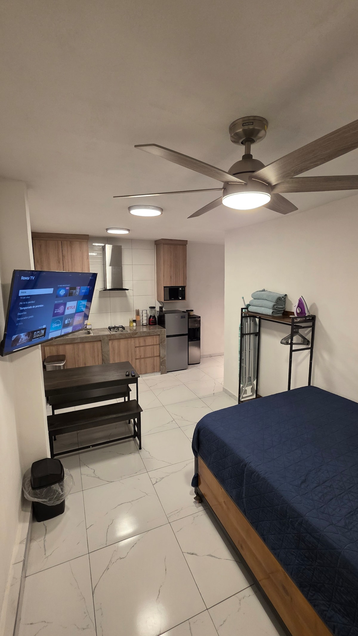 Departamento completo con 1 habitación a 10 min del Aeropuerto Internacional Mariano Escobedo, a 10 min del centro de Apodaca, la habitación cuenta con su baño propio y clóset. El departamento está en un tercer piso, por lo que hay que subir escaleras. En la sala de estar hay un sofá cama y televisión, cuenta con cocina equipada, lo único que se comparte es el área de lavandería en PB. Es una colonia privada, por lo que ocupas código para entrar al fraccionamiento, es muy seguro y tranquilo,