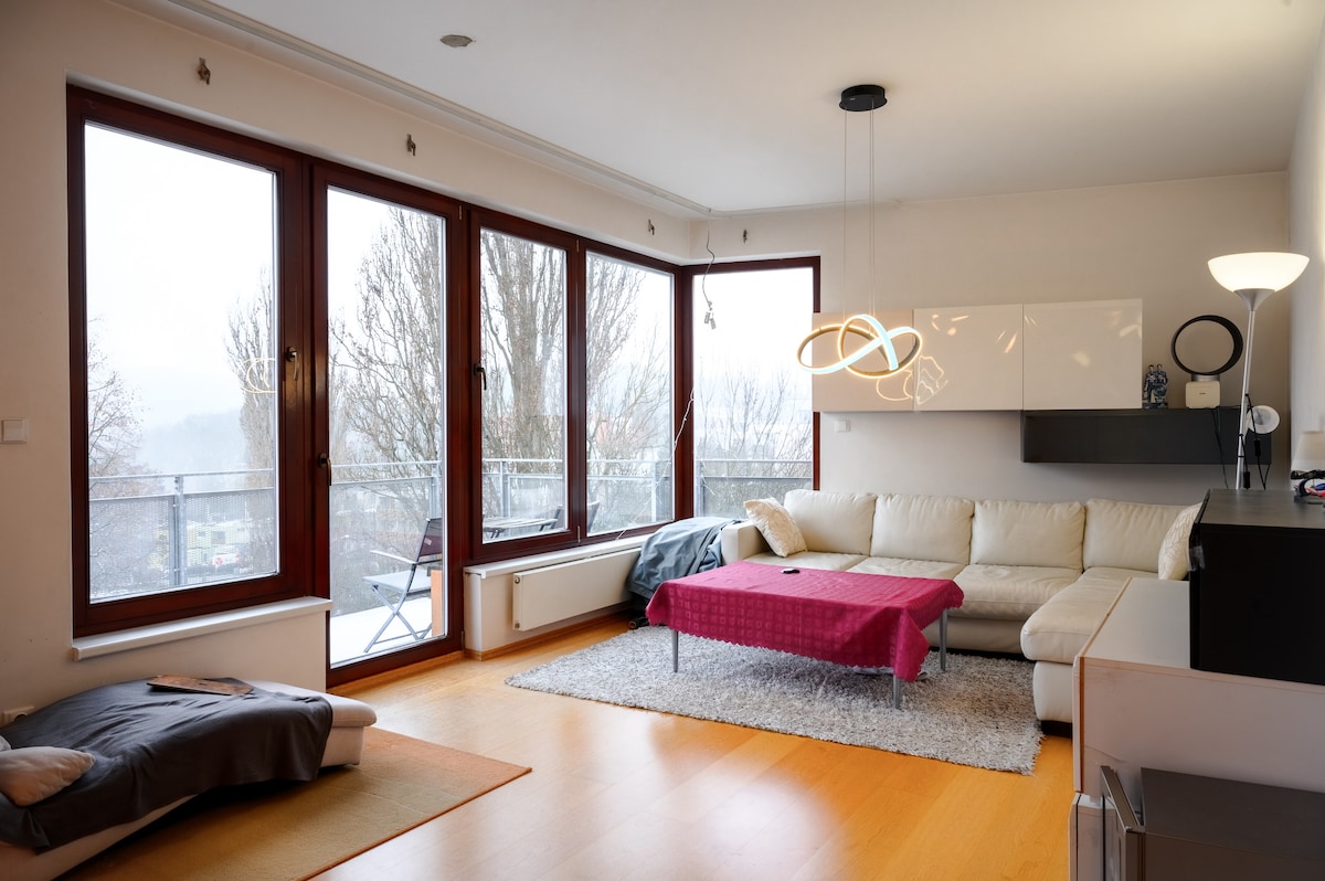 Marina Boulevard Penthouse with 110sqm apartment with large terrace with BBQ. All just 8minutes from the city center. A perfect holiday get-away or home office for the traveler. Marina Boulevard Penthouse is located in Prague 8 in a private housing area. Situated on the Banks of the Vltava River with secluded walks to the City center via green parks or to Prague's largest park 'Stromovka' along the river north. 2 minutes from Libensky Most Tram stop or 5 minutes to Palmovka Metro.