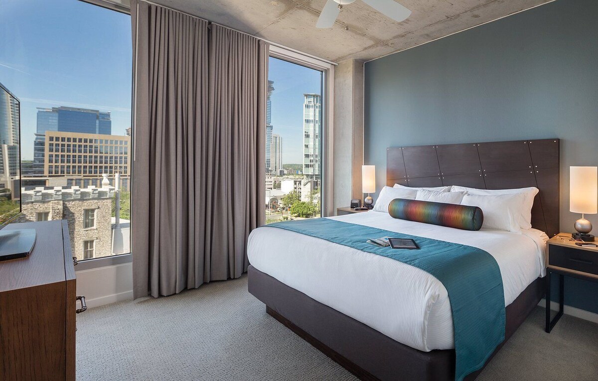 Lounge in style when you stay at this swanky & upscale place during Labor Day in a 1 bedroom Condo in Chic Boutique hotel-Retro Decor. Enjoy Plush accommodations from King Size Bed, washer/dryer, full kitchen /Modern Day large appliances. Sep. living area w/queen size sleeper sofa. Lockoff Mstr Bathrooms w/Marble fit for a King. Rooftop Infinity Pool w/hot tub, Barbecue Grills and amazing fire Pits. Located in the heart of downtown w/Balcony w/amazing views of TX Capitol City.