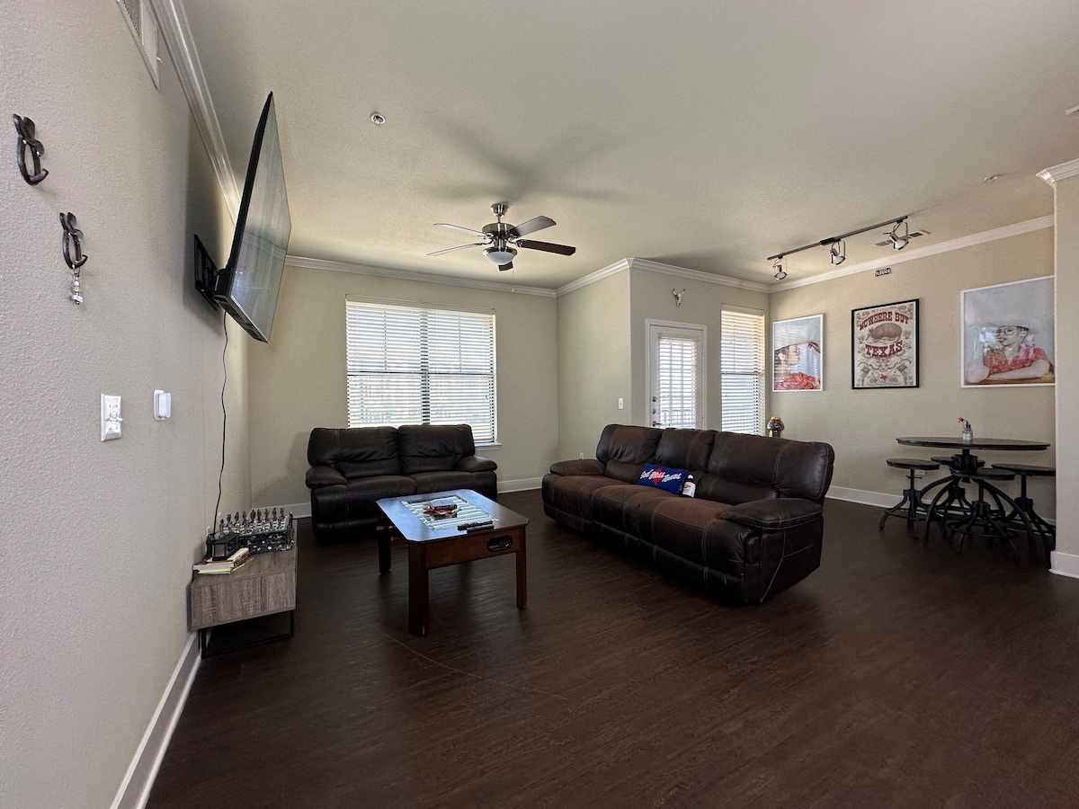 Welcome to our cozy 1-bed, 1-bath Texas-themed apartment! Featuring vintage texas decor, and a vibrant Texas pride, this space offers comfort and charm. Enjoy a relaxing living area with a 80 Inch TV, a fully equipped kitchen, and a plush KING -sized bed for a restful stay. The modern bathroom has all the essentials, and the apartment is just minutes from local attractions & downtown. Perfect for a weekend getaway or an extended stay, it’s the ideal home base for exploring Austin Texas baby!