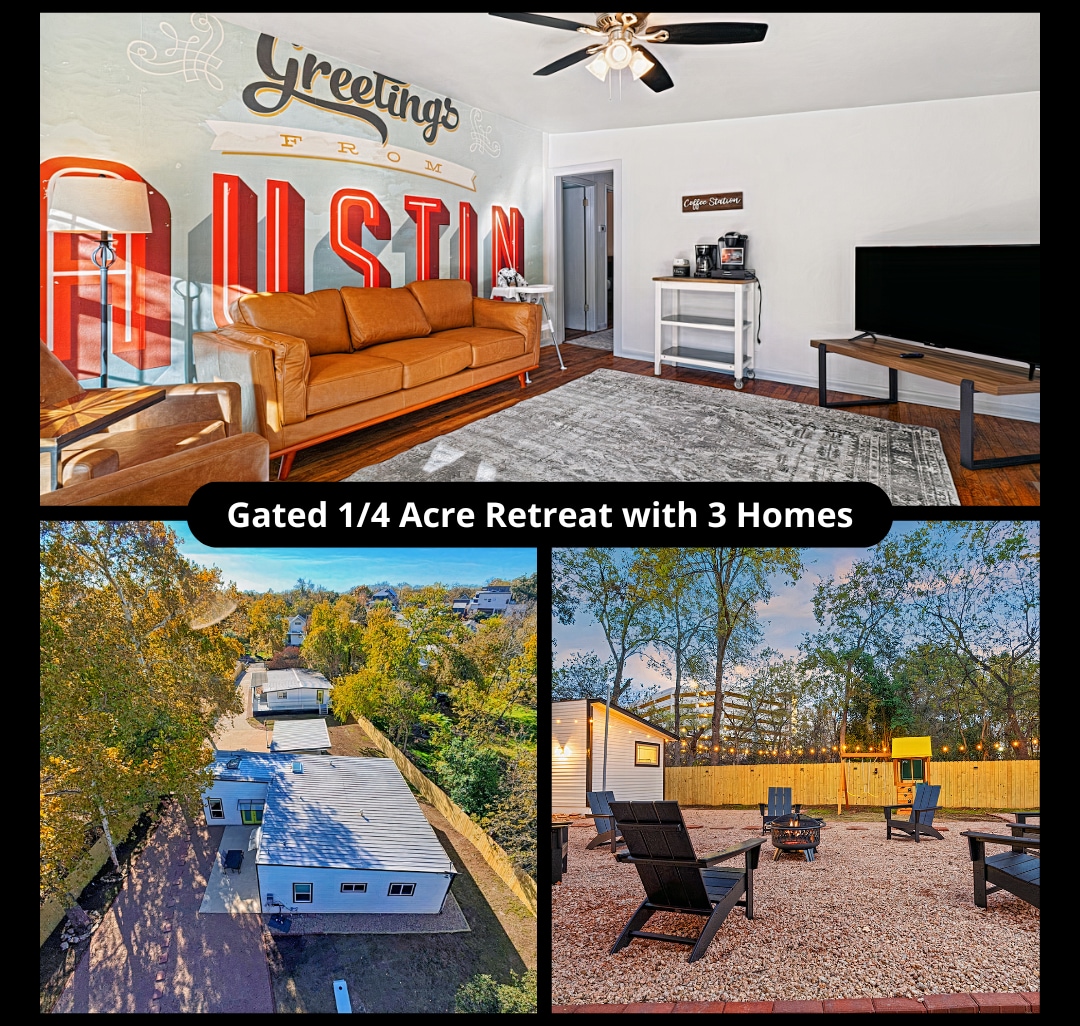 🏡 Experience Austin charm in this gated ¼-acre retreat with 4 comfortable bedrooms and 2 bathrooms. Perfect for families, groups, or workcations, the home features a bright living area, a fully equipped kitchen, high-speed WiFi, and free parking. Step outside to enjoy a fire pit 🔥, BBQ grill, swing set, and 500-year-old oak trees 🌳. Guests also have access to a shared game barn 🎮 and fenced dog park 🐾—all just minutes from downtown and top Austin attractions!
