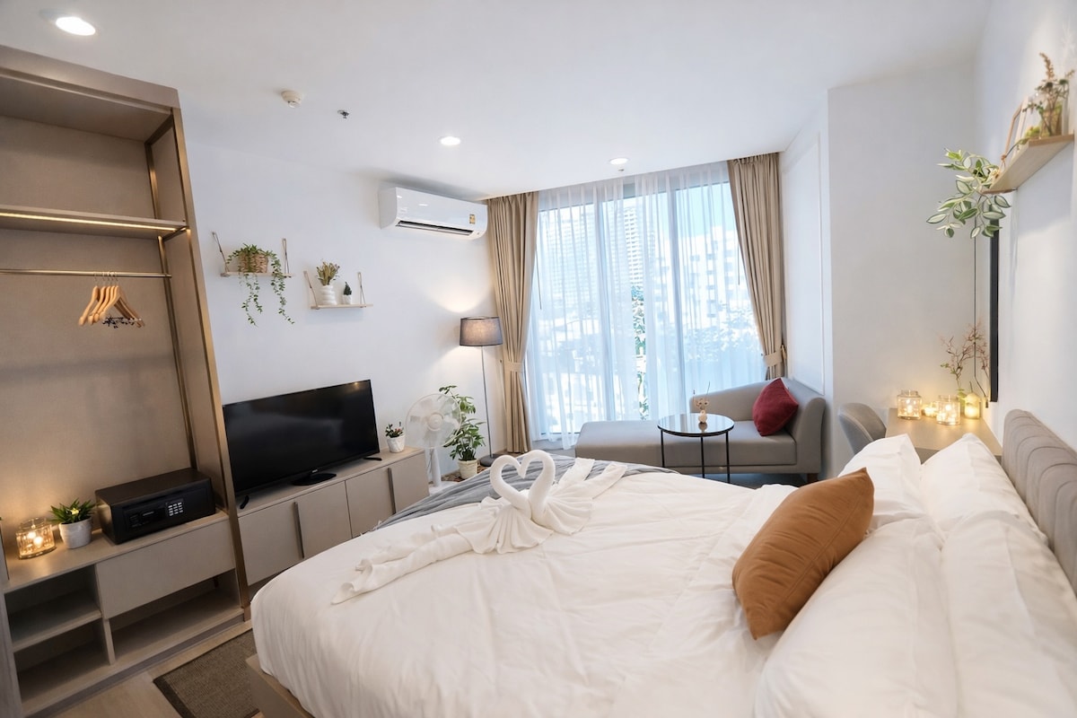 Modern studio in the heart of Pattaya with a comfortable queen bed and large sliding window for fresh air. Fully equipped with Smart TV, private WiFi, microwave, and washing machine. Bathroom includes hot water, shampoo, and towels.