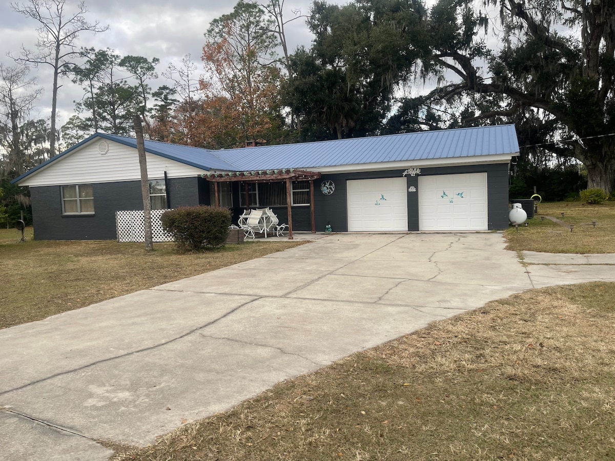 The greenhouse River Ranch it is a 3000 square-foot four bedroom three bath home on 15 acres with a beautiful panoramic view of the historical Suwanee River in Lafayette County. Completely renovated from top to bottom in 2021 with comfort in mind for friends and family to enjoy. As you enter the gates a short drive through an open field large Hammock oaks and beautiful pines scattered throughout the property. On the ground level there is a outdoor shower bathroom and a full-size fridge.