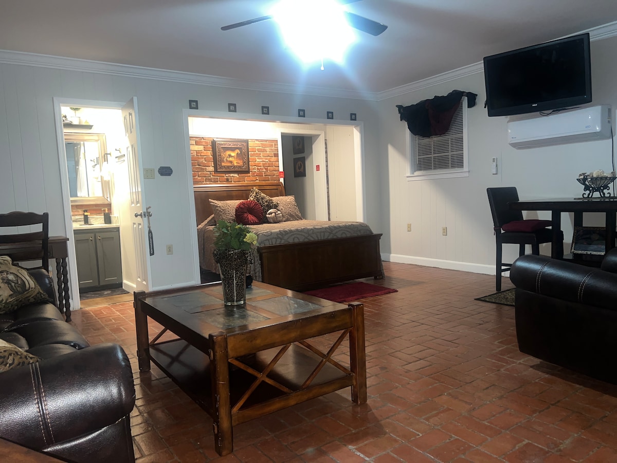 Located three blocks from historic downtown New Iberia, this studio apartment features a deep fenced-in porch out the front door and a sun deck out the side door. A walk-in closet, full bath, and mini-kitchen give you everything you need to call home. Enjoy the simplicity of this peaceful cottage with access to the common areas of the main house, filled with 120 years of history. In addition, the gardens feature a patio with a table for six, a barbecue grill, and a fire pit for cool evenings.