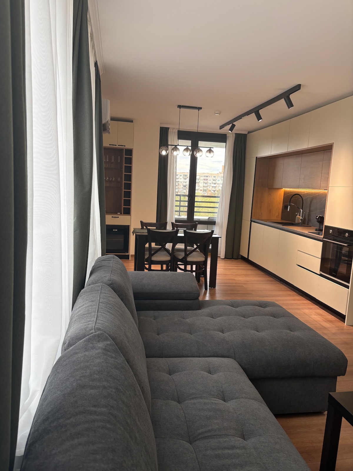 This brand-new one-bedroom apartment is located in a newly built residential complex in Druzhba, right next to the metro station — giving you quick and easy access to the city center, the airport, and all major attractions. Designed with comfort and style in mind, the apartment features a bright open-plan living area, a fully equipped kitchen, a cozy bedroom with a queen-size bed, and a private balcony — perfect for morning coffee or relaxing after a day in the city.