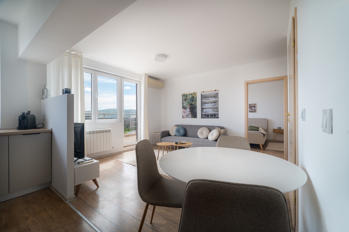A brand new inviting apartment with a great view of Vitosha mountain. Furnished in a contemporary interior style, which makes it feels airy and spacious. The apartment is located in a private complex, on the 9th floor. A cozy and comfortable place! Just 8min walk from Inter Expo Subway Station and 10min away from the city center by car. It is also convenient to get to the airport, both by subway and taxi.
