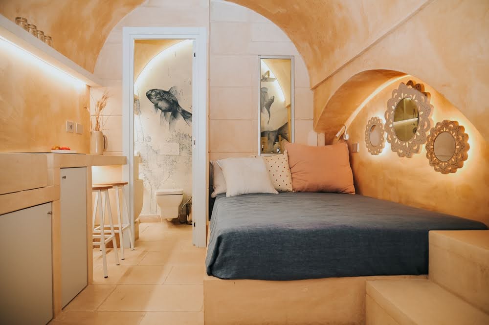 Cosy cottage in quiet, leafy cul-de-sac in the heart of Otranto. Bedroom, bathroom (with shower), living room/kitchenette, tiny private terrace. Air conditioned. Very close to the Cathedral, the Castle, the sea and the beaches. At the beginning of 2024 the walls were repainted with natural lime, USB sockets and a new refrigerator were installed.