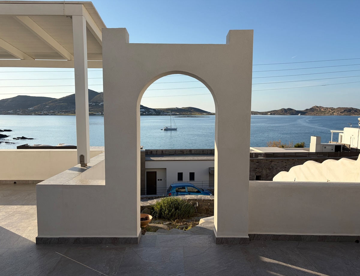 Open the sea-blue shutters and let in the cooling breeze, then whip up a snack at the urban concrete kitchen countertop at a breezy waterfront retreat. Step onto the spacious, leafy veranda for leisurely sunset drinks with unobstructed ocean views! The apartment is situated next to a sandy beach for a morning swim and a 2-minute walk from the center of Naousa and its main square. Shops, restaurants, bars, and clubs are within walking distance, yet the area is very quiet and calm!