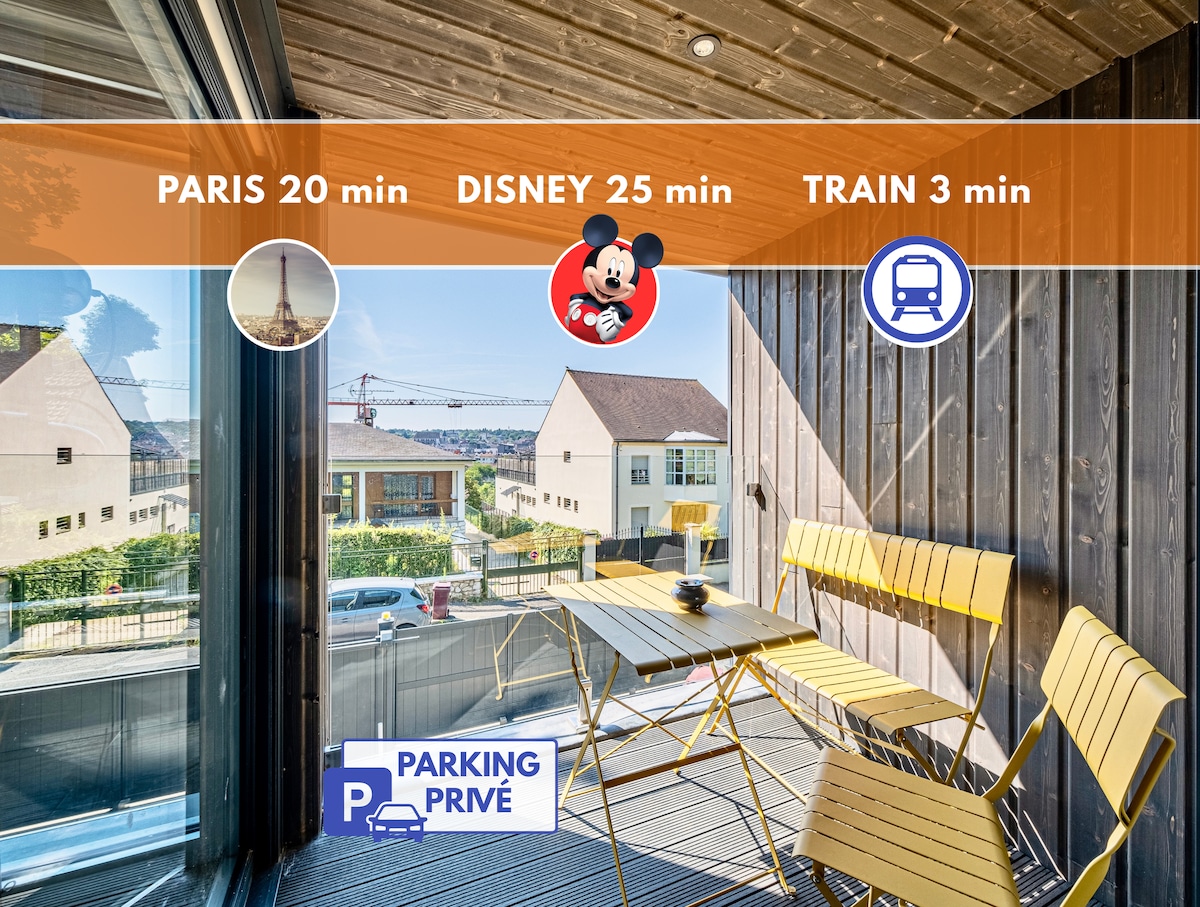 Located 50 meters from Lagny-sur-Marne train station, close to shops, Disneyland and 24 minutes by train from Paris Gare de l'Est Quiet and secure residence. New apartment of 45 m2 for 4 people. 1 bedroom with Queen Size bed (160x200). 1 sofa bed in the living room (140x190) with quality mattress. Fully equipped kitchen. Bathroom with large shower. Private and secure parking space. Bed and bathroom linen provided upon your arrival. Travel cot available.