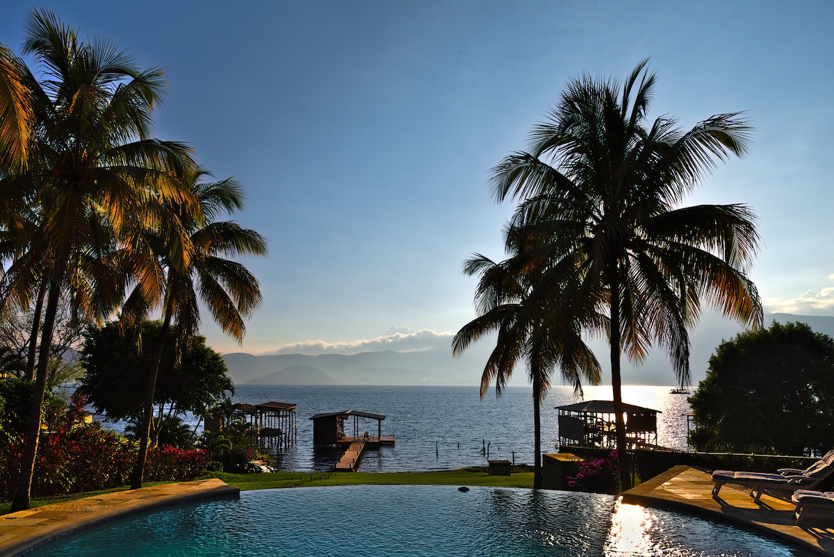 Take it easy at this unique and tranquil getaway with a spectacular view of the lake, Santa Ana Volcano and mountainside. Private parking area, Infinity pool, outdoor spaces with an open fire for cooking and a custom brick oven. Home offers three levels of outdoor space to enjoy the view and the pool while sipping on fresh brewed coffee or a cold beverage from the fully equipped kitchen. If you prefer a break from cooking, there are numerous restaurants within walking distance or a short ride.