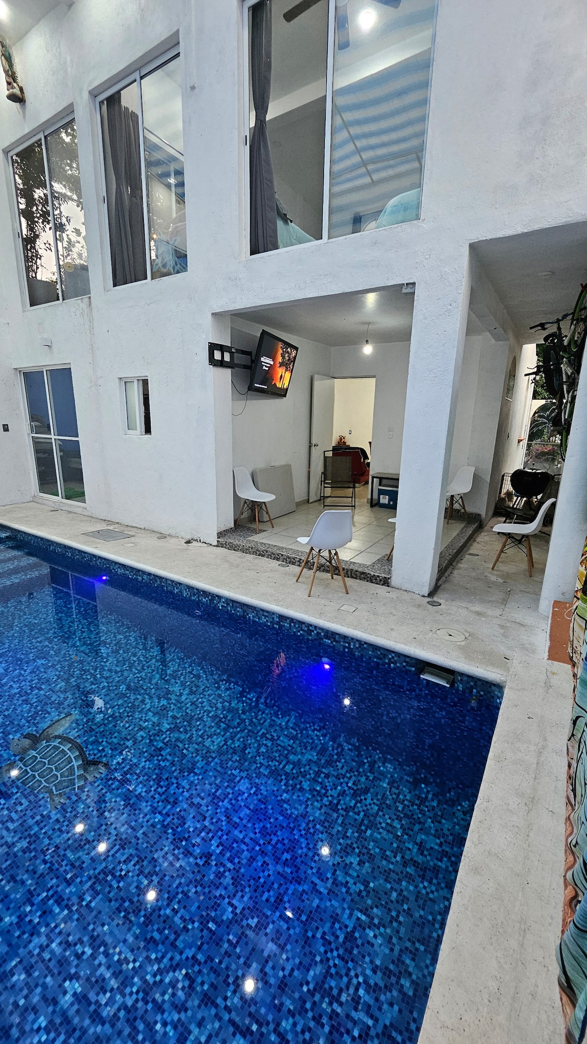 Casa en Club Náutico Teques. Con muelle directo al lago. Hermosa vista a la alberca. Disfruta la Terraza privada con asador, camastros y comedor exterior mientras ves a tus hijos o amigos nadar sin asolearte. Cuenta con 2 recámaras con A/C, cocina equipada, Smart TV, WiFi, seguridad 24/7 y 2 bicicletas. Cerca de Jardines de México y Arena Teques.Máx. 6 personas, 1 mascota, 1 estacionamiento.Cancha de paddle a 5 min. Todo lo que buscas para disfrutar unos días de descanso en Tequesquitengo.