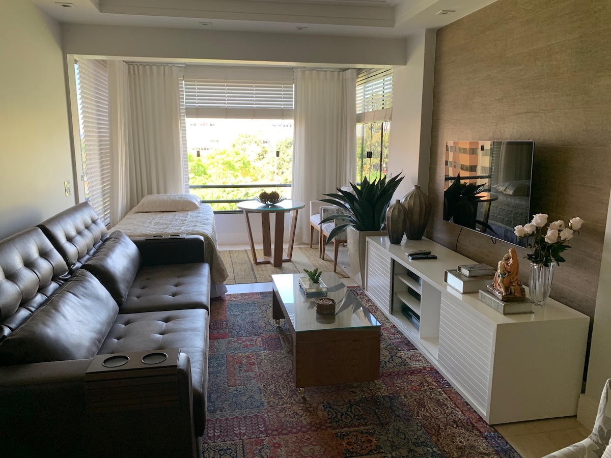Apartamento no Life Resort, em frente ao Lago Paranoá, jardim e piscinas, decorado para o bem-estar dos hóspedes, com mobiliário novo, cama-box queen, frigobar, tv de 50", cafeteira Nespresso, filtro com água gelada, armários e suporte para mala, ferro de passar, secador de cabelo, berço desmontável (sob solicitação), coktop, microondas, pratos, copos, talheres, panelas e utensílios. Como cortesia: mini sabonete, shampoo e condicionador, roupa de cama e banho, produtos de limpeza e WiFi.