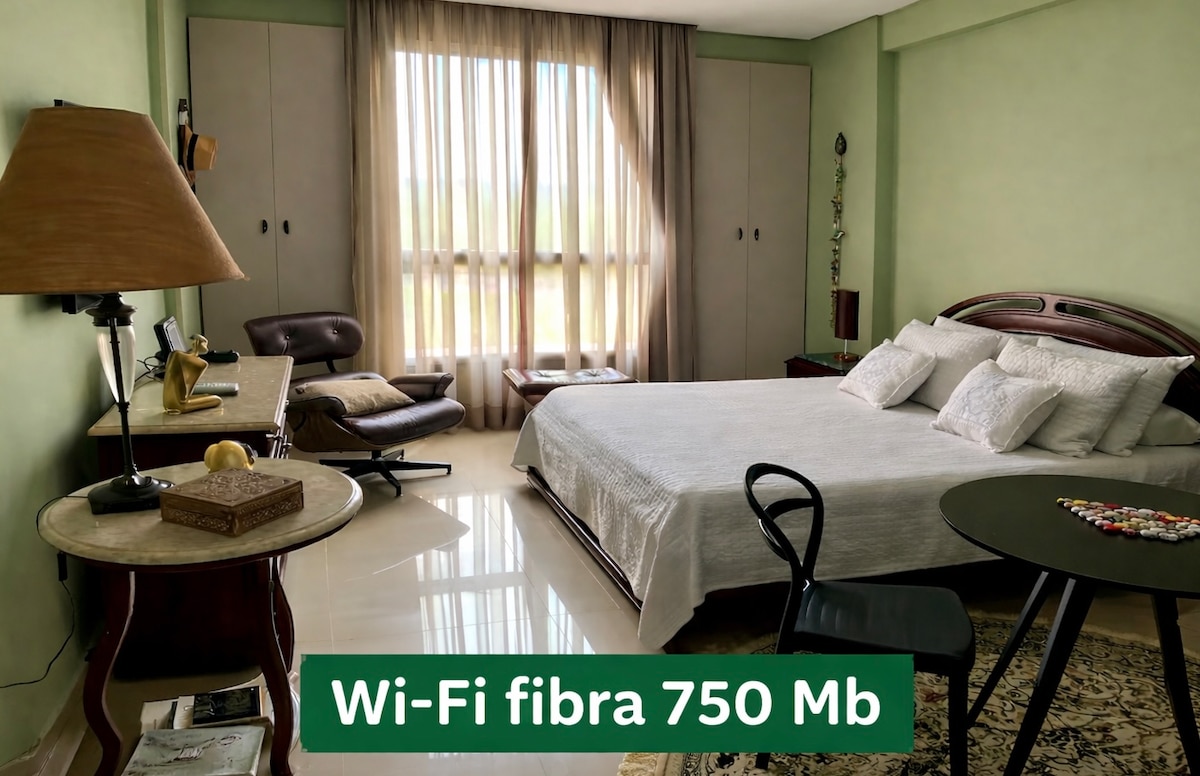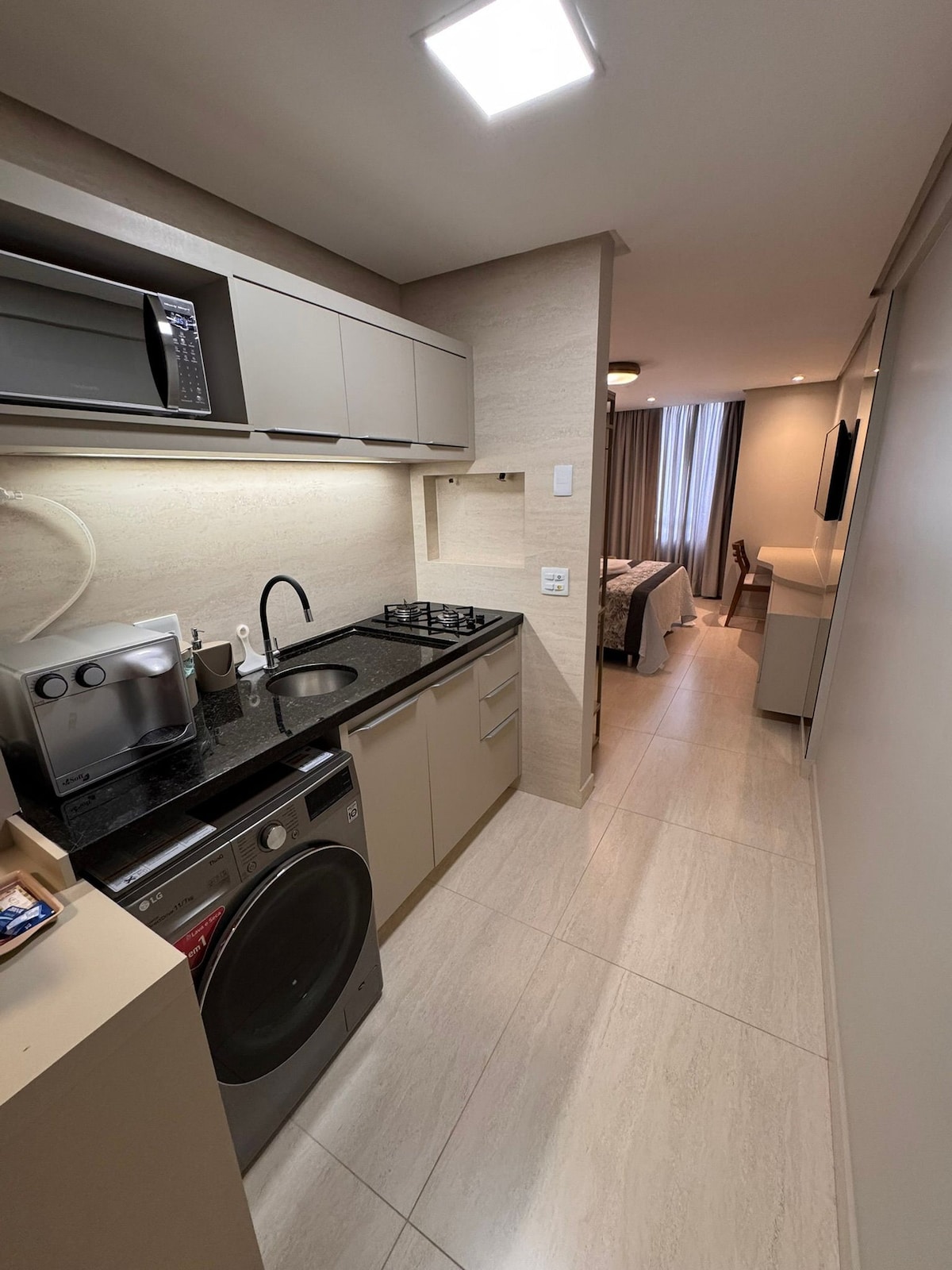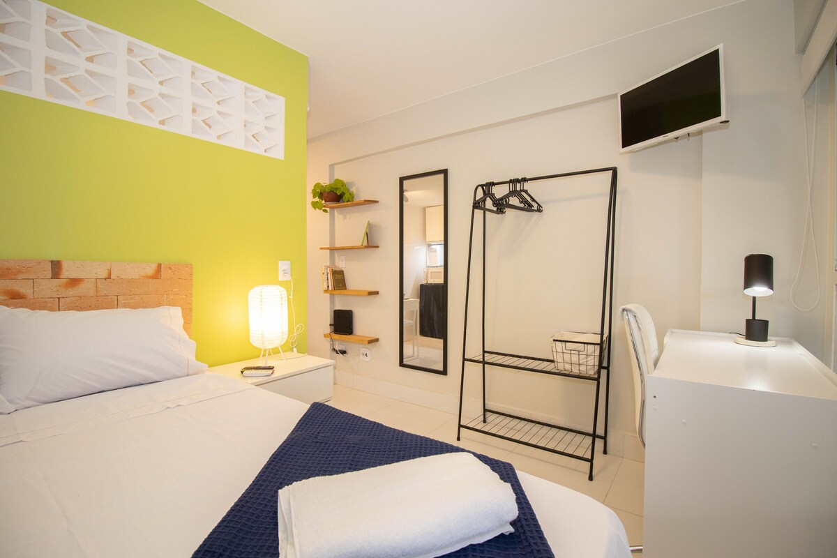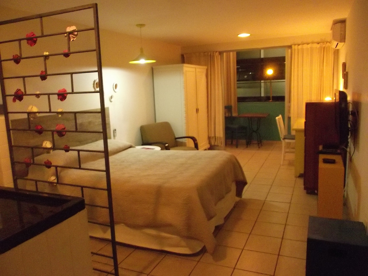 Agradável Studio, quarto/sala/cozinha, banheiro, com box espaçoso, varanda com mesa para refeições, cama box Queen, armário e comoda para roupas, espaço exclusivo de trabalho, Wi-Fi com 390Mbps. Roupas de cama e banho, TV LCD 32" a cabo NET com múltiplos canais, Netflix, frigobar, micro-ondas, forno elétrico, cafeteira elétrica, sanduicheira, fogão eletrico de uma boca, liquidificador, ferro e tábua de passar roupas, ar condicionado Split. Studio seguro em prédio familiar.