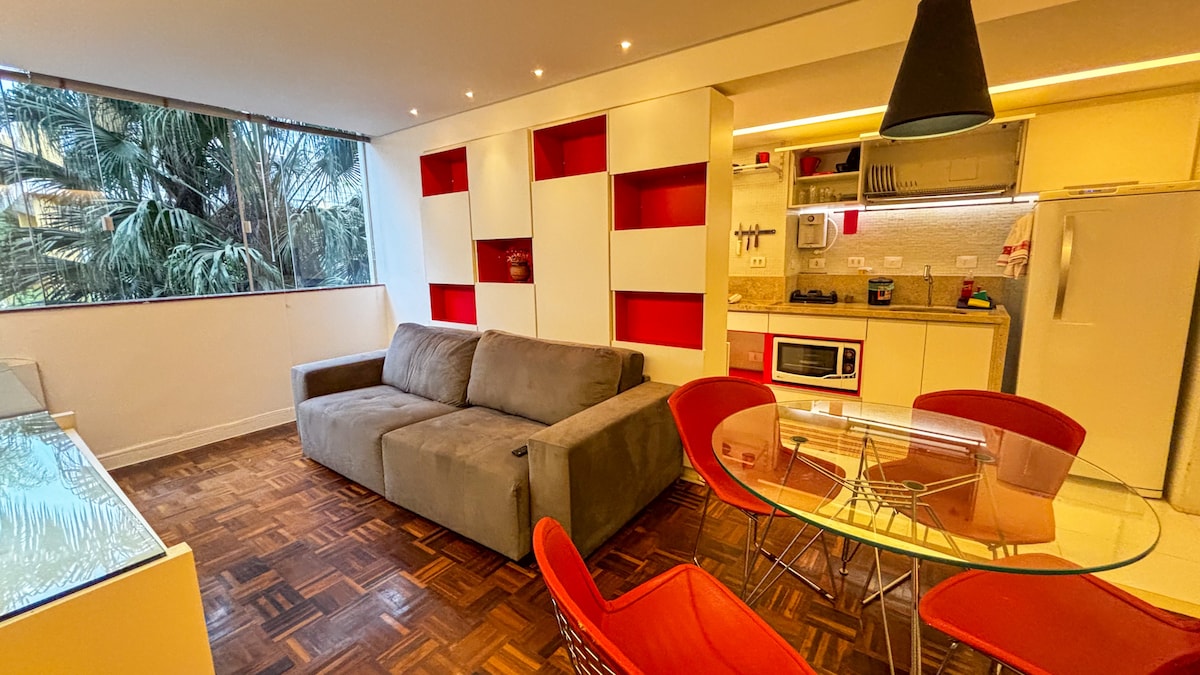 Apartamento reformado, projeto do escritório Mínimo Arq (@minimo arq br). O espaço amplo e integrado, com excelente iluminação e ventilação naturais, proporciona conforto e bem-estar. Com estilo minimalista, privilegia os elementos essenciais. A espaçosa varanda, sempre fresca, com vista para área verde permanente, foi restaurada, mantendo a originalidade do prédio. Para pessoas que apreciam um ambiente moderno, confortável, limpo e completo. Adequado para estadias curtas e longas.