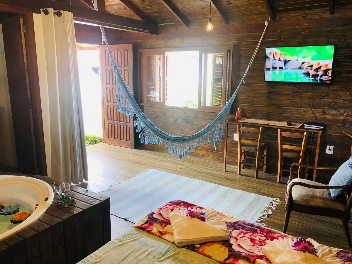 A Rustic Cottage in front of the Conceição Lagoon, surrounded by Native Forest, with a Crystal Water Stream to bathe, a heated Jacuzzi with spring water, sacred fire to warm the nights and an incredible garden to sunbathe or meditate. It is a chalet of great comfort and also privacy. Ideal for couples looking to celebrate love, friends looking to get together and enjoy nature, families who want peace and quiet, or writers and artists looking for inspiration.