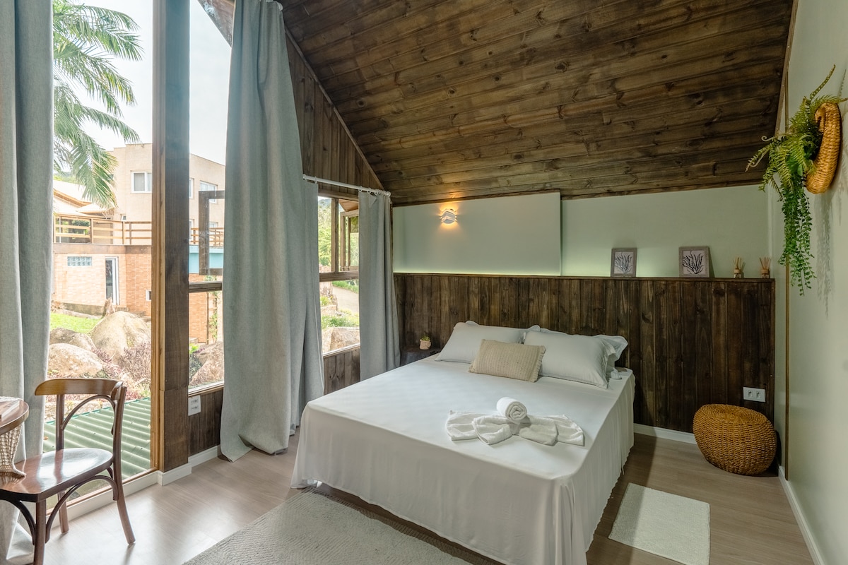 CHALÉ BOSQUE DA BRAVA Horários estendidos e flexíveis: ♡ Check-in: a partir das 8:00 ♡ Checkout: até às 18:00 Romântico, aconchegante e privativo! Equipado, rústico e com estilo Alpino, para momentos inesquecíveis! Ideal para casais, mas também comporta confortavelmente 3 pessoas. Fácil acesso, seguro e com garagem coberta. Localização privilegiada, a 1.200 metros de 3 belíssimas praias: Brava, Ponta das Canas e Lagoinha do Norte.