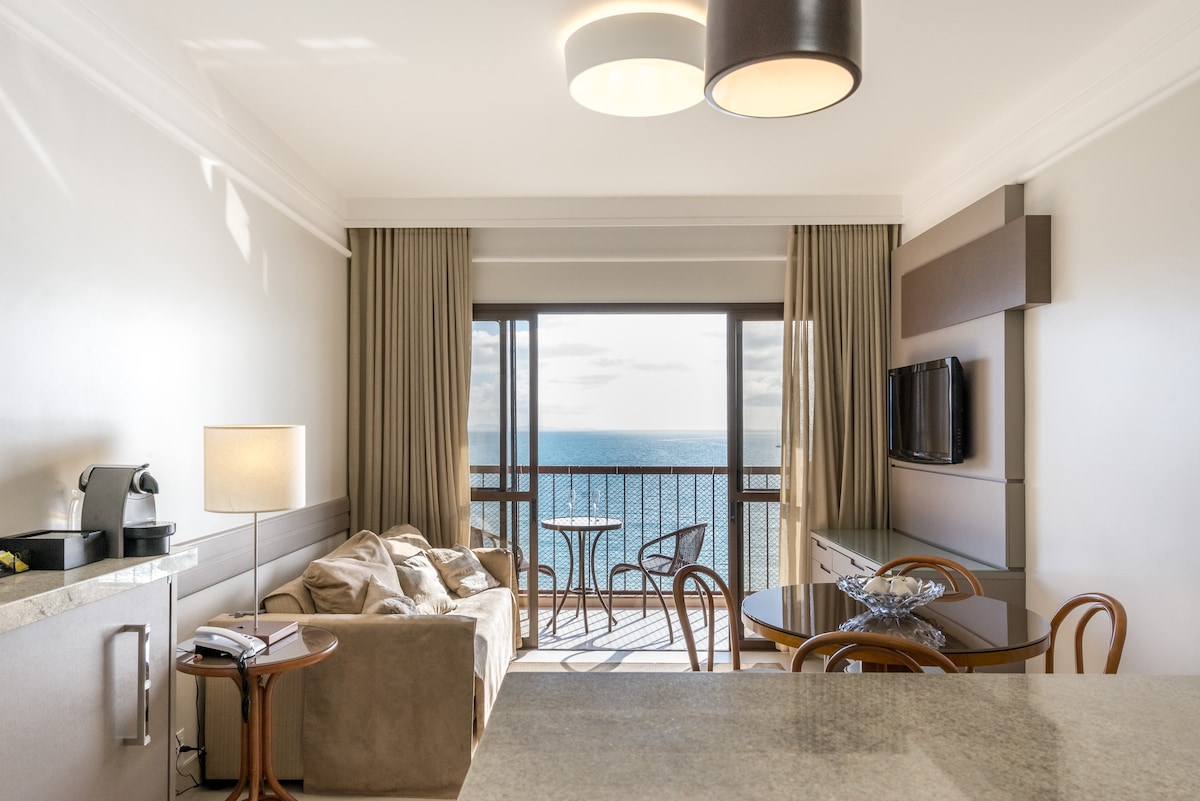 Este lugar único e cheio de estilo é o cenário ideal para uma viagem inesquecível. Quarto de hotel para até 03 pessoas com pé na areia e uma área de lazer maravilhosa! Jacuzzi, piscina aquecida, piscina , academia, monitores para crianças , restaurante, serviço de praia, sauna e uma vista de tirar o fôlego.