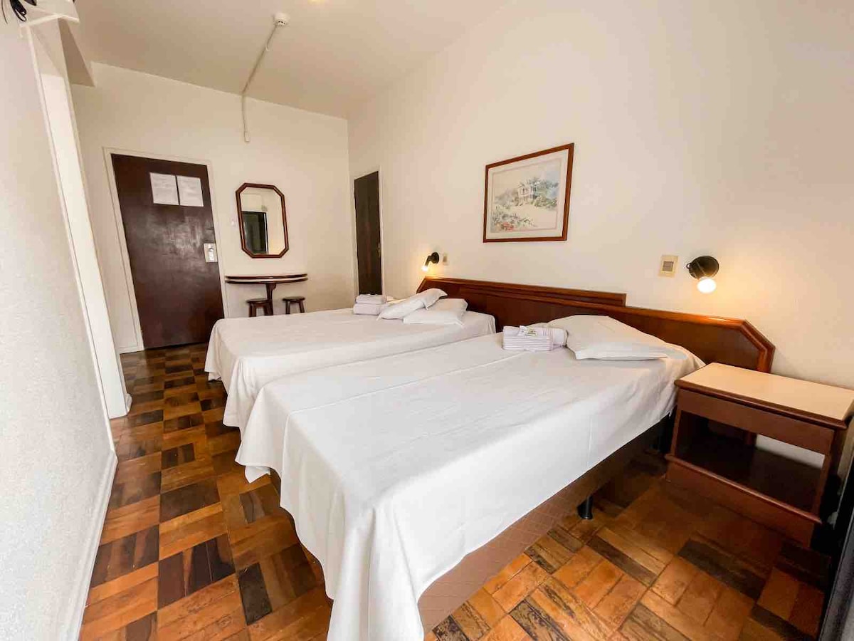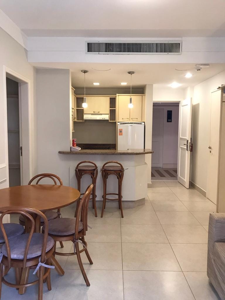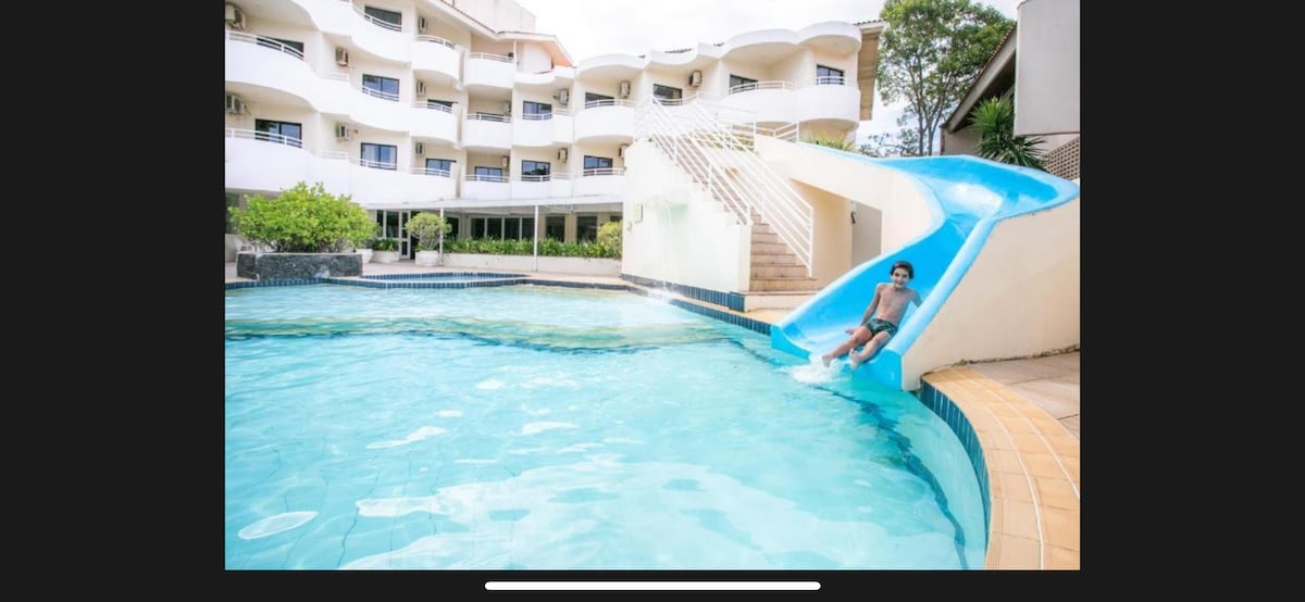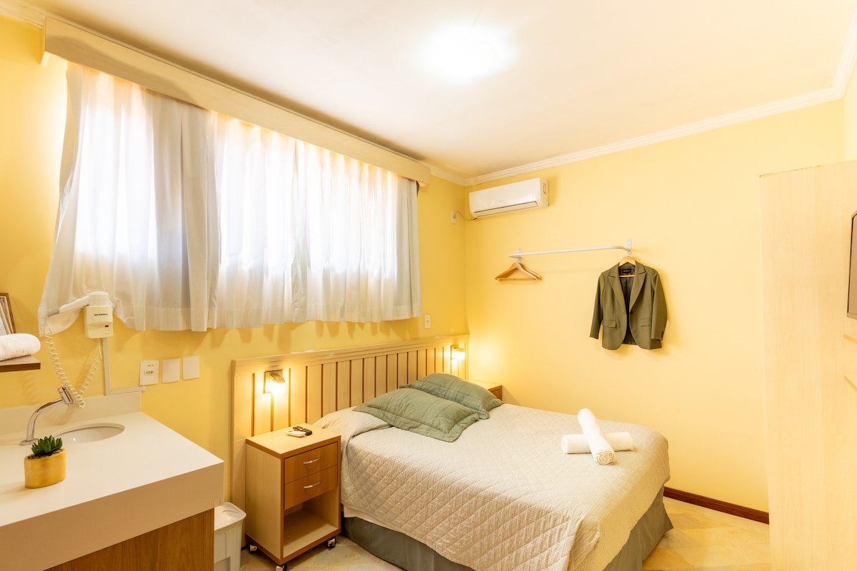 Apartamento tipo hotel. Dormitório e banheiro com TV, AR condicionado e frigobar. Estacionamento e café da manhã terceirizado, cobrado a parte direto no local. Relaxe neste lugar único e tranquilo. * Check-in após as 15 horas - Check-out as 11 horas. * Diárias sem café da manhã