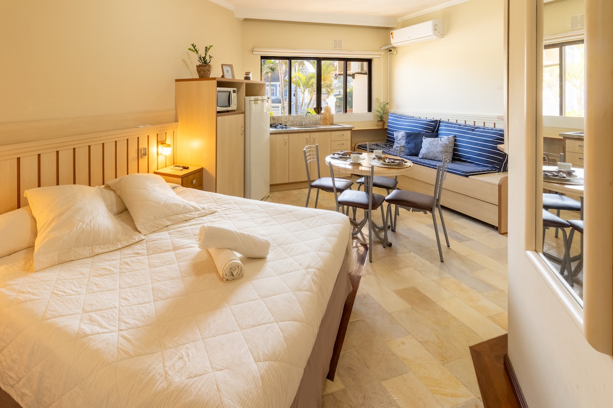 Apartamento tipo hotel. Dormitório e banheiro com TV, AR condicionado e frigobar. Estacionamento e café da manhã terceirizado, cobrado a parte direto no local. Relaxe neste lugar único e tranquilo. * Check-in após as 15 horas - Check-out as 11 horas. * Diárias sem café da manhã * Proibido animais de estimação * Apartamento tipo hotel para 2 pessoas * Recepção 24h