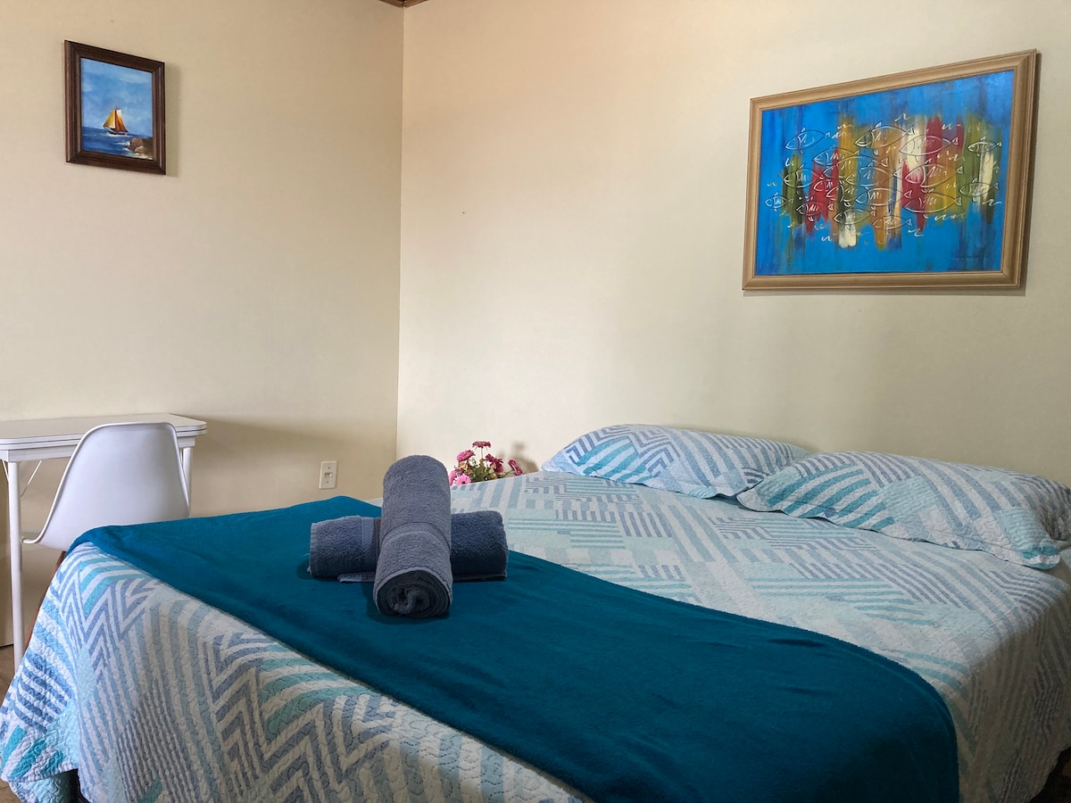 Local iluminado e arejado com cama de casal, cortina blackout, tv, ventilador e wi-fi; banheiro anexo na área EXTERNA, de uso exclusivo do hóspede; cozinha completa com fogão, geladeira e microondas, utensílios e churrasqueira. O espaço fica na minha casa, mas é todo de uso exclusivo do hóspede, o pátio é compartilhado, Então se você gosta de Compartilhar Sorrisos será Muito Bem Vindo Temos 2 gatinhos que fazem parte da família e circulam por todo o quintal Estacionamento APENAS PARA MOTO