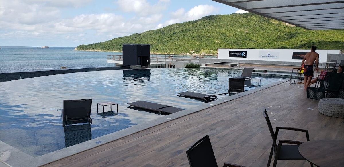 Relaxar e curtir em um Resort 5 estrelas em Jurerê Internacional, acordar, ir na sacada, olhar pra praia e pra piscina, e escolher onde prefere ir para aproveitar o dia. E a noite curtir os bares e restaurantes a poucos metros. Esse Resort, ao lado do mar, conta com recepção 24h, serviços de hotel, roupas de cama e banho, amenidades (shampoo, etc), piscinas externas e internas (aquecidas), sala se jogos, recreação infantil, playground, academia e praia a poucos metros.Você vai se encantar!