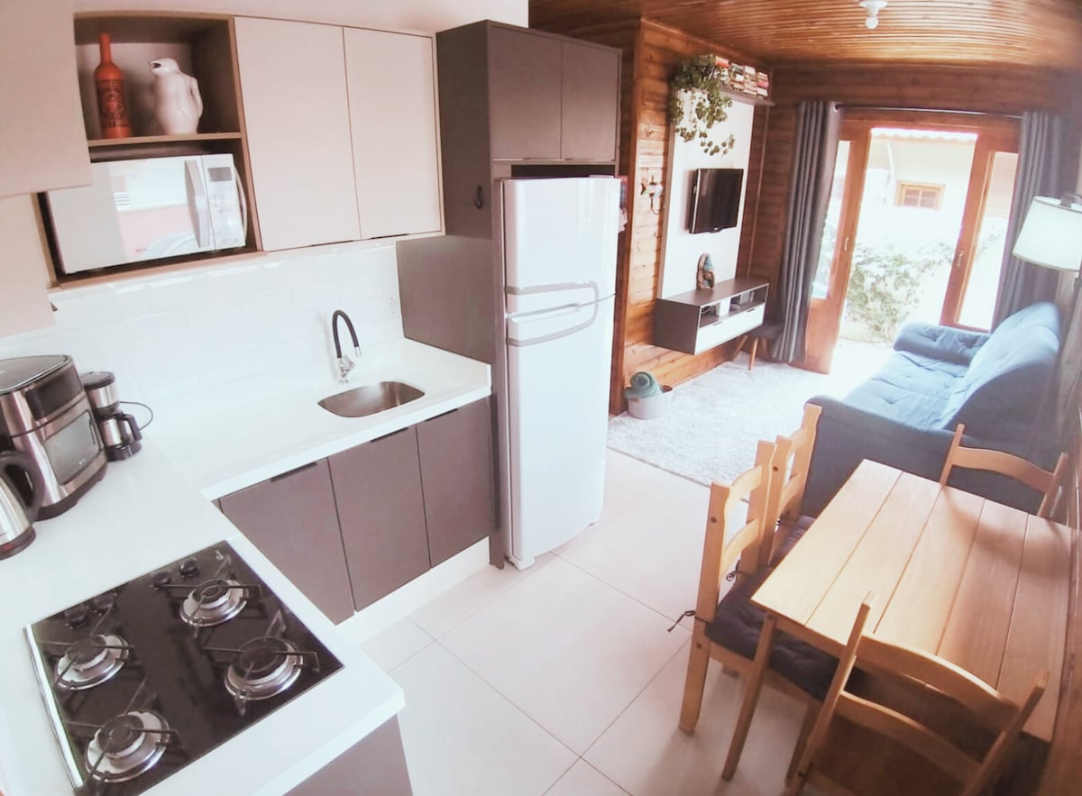 Chalé com vista para o pôr do sol e para o mar. Banheira de hidromassagem e chuveiro com aquecimento a gás Quarto com sacada, sala com sofá super confortável e Smart TV de 42’’ Cozinha completa Deck e sacada com vista para o pôr do sol Estamos a apenas 400 metros da Praia do Forte e Jurerê, e pertinho do P12. Decoração romântica: Consulte as opções disponíveis no momento da reserva.