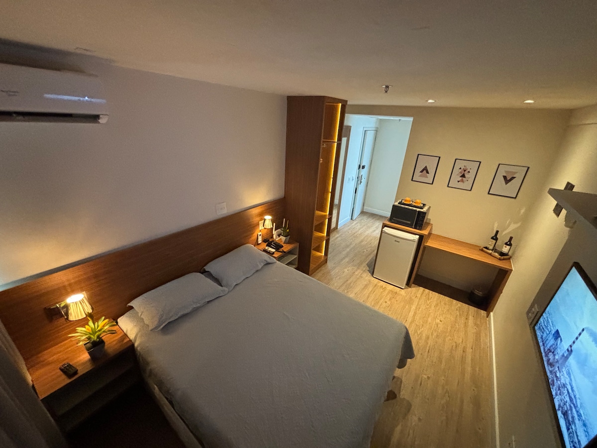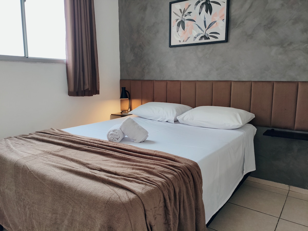 Curta uma experiência elegante neste lugar bem-localizado. Bem próximo de supermercados, padarias, restaurantes e todo tipo de comércio. Melhor localização da cidade com todo o conforto do serviço de um flat. Café da manhã não incluso, mas oferecido pelo restaurante do hotel, bem como almoço e jantar. A estrutura do condomínio conta com portaria 24h, piscina, sauna, academia, brinquedos para crianças e estacionamento no local e na rua.