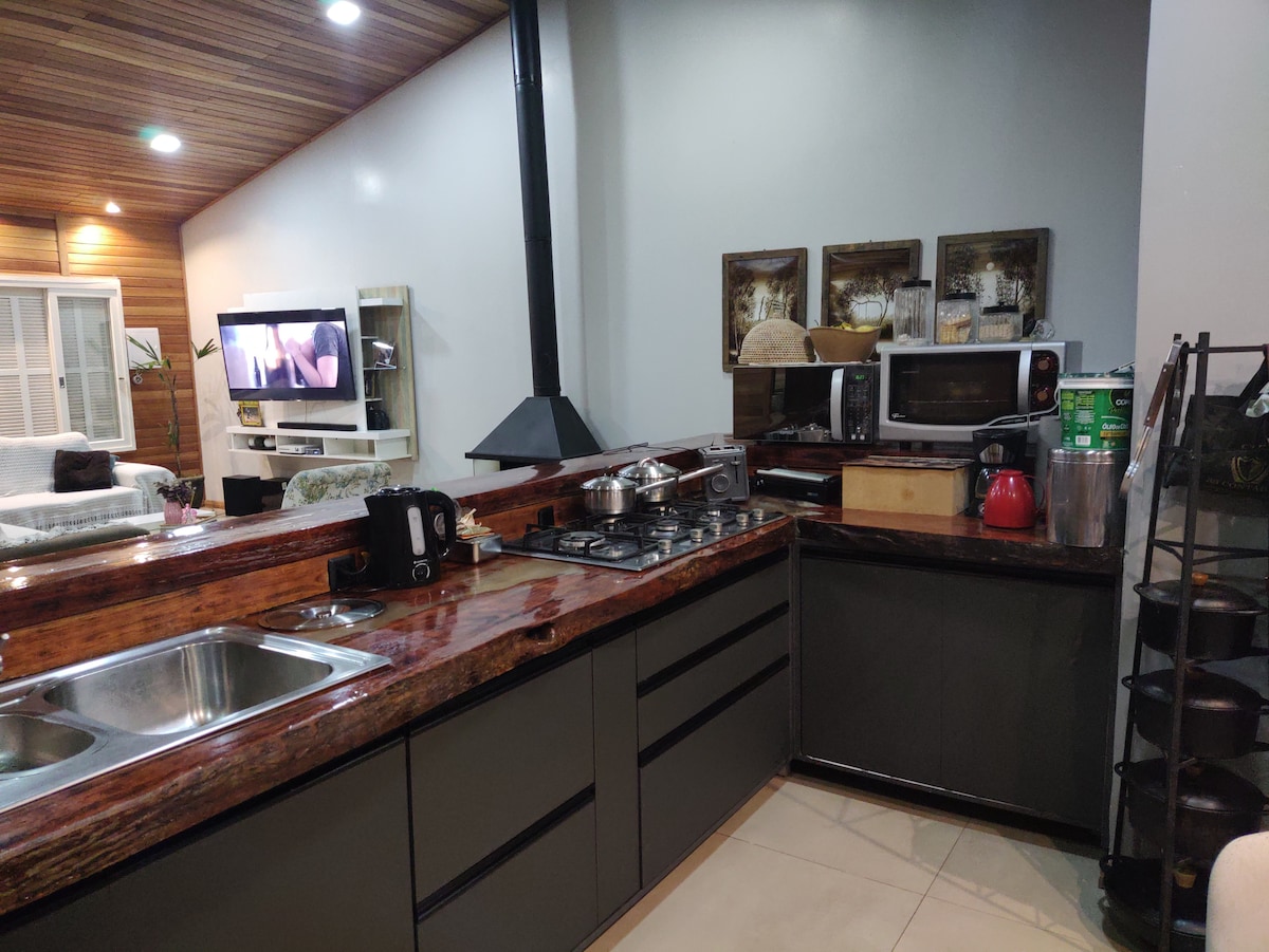 Todos os quartos e áreas comuns possuem ar condicionado. A casa possui área de churrasqueira interna com pia, fogão e geladeira e um quiosque com churrasqueira, pia e freezer. São 4 quartos, sendo 1 suíte e mais dois banheiros. TV com canais abertos na sala e na suíte. Para o feriados prolongados devem ser alugadas, no mínimo, 3 diárias. Não fornecemos roupas de cama e toalhas. Esses itens devem ser levados pelos hóspedes. O consumo de água e energia elétrica não estão inclusos na diária. Serão cobrados à parte, mediante fotos dos medidores na chegada e na saída. Não é permitido estacionar sobre o gramado.