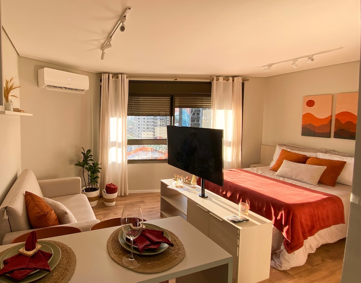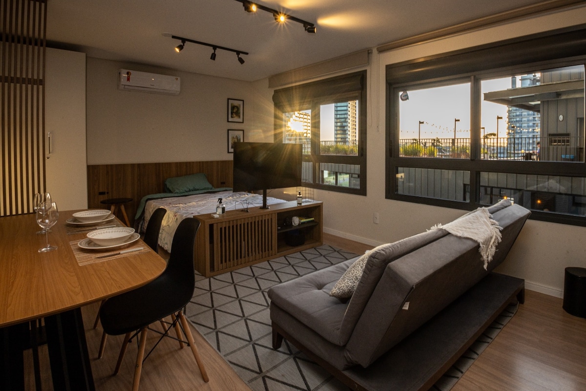 Studio na melhor localização de Pelotas. Ter uma ótima estadia em um local completo, aconchegante, no Parque Una, um dos cartões postais de Pelotas. Você encontrou ! ❤️🍷🍽️😁 Comodidades: - Estrutura nova e sofisticada para agradabilidade - Jogo de Toalhas - Secador de cabelo - Mesa de trabalho -Cozinha completa -Air Fryer, -Fogão de indução,panelas,Torradeira,Microondas -cesta de piquenique -Wi-Fi - SmartTV 43" Lg - Ar Condicionado Quente e Frio - Portaria24h