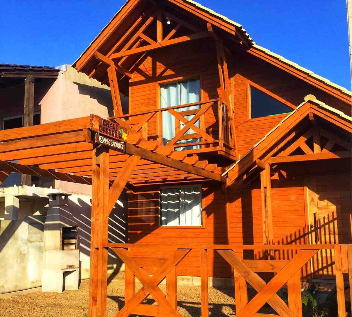 Chalé em madeira, com uma cama de casal no mezanino e uma bicama no estar com dois colchões de solteiro, cozinha completa, banheiro, estar, varanda em L com rede e churrasqueira, ar condicionado 22K, Wifi 60MB com fibra óptica, tv 32 smart , microondas, sanduícheira, liquidificador, cafeteira elétrica, garagem e uma ampla vista para o mar e para a serra.