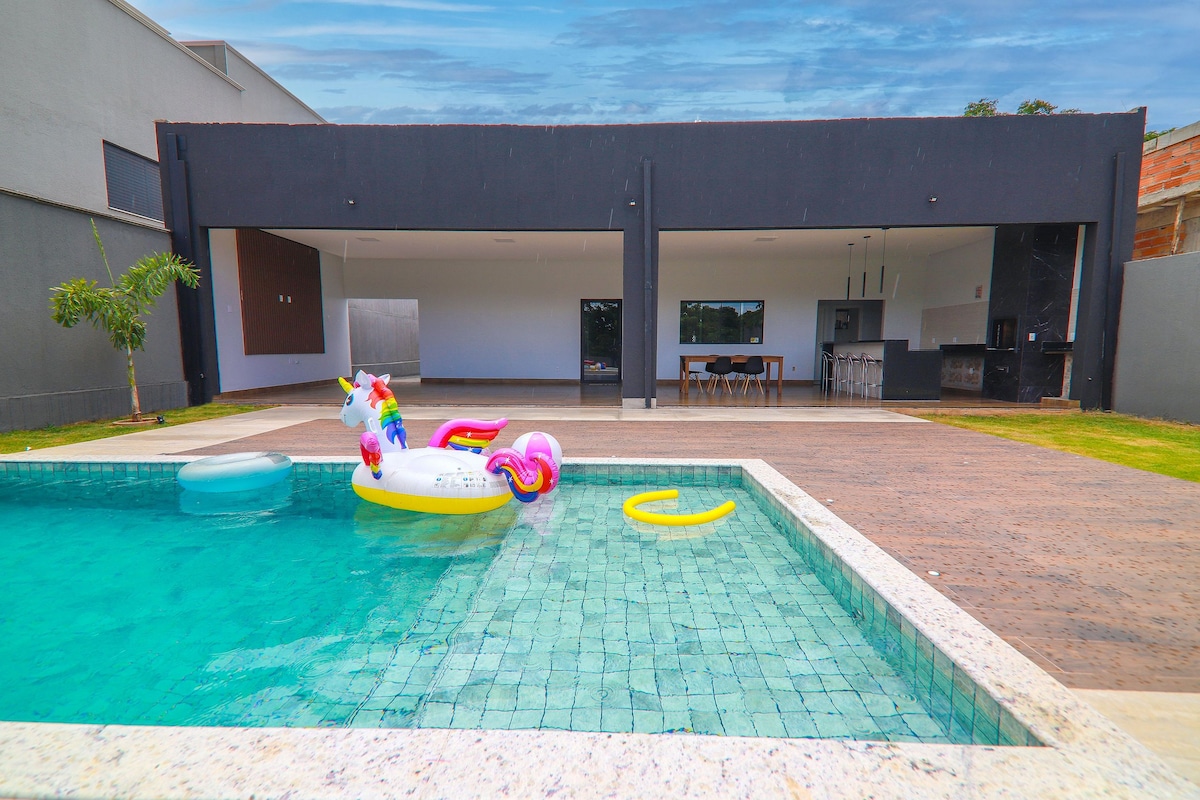 Piscina quentinha sem se preocupar com o sol? Venha desfrutar da minha residência, longe dos condomínios e prédios com suas área de lazer compartilhada. Aqui você desfruta de todo conforto e privacidade com garantia de uma piscina aquecida com sistema híbrido (não depende do clima ou sol). São 3 quartos (2 suítes), WiFi, TV com Disney, Netflix, Max, ar condicionado, garagem, churrasqueira, cozinha completa, roupa de cama, berço. Tudo isso na região central da cidade e com mercado pertinho.