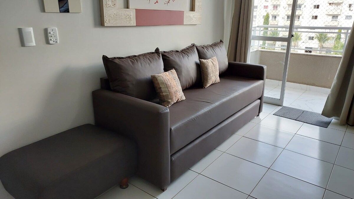 Apartamento no Lagoa Quente Hotel, em Caldas Novas, ideal para famílias e casais, com capacidade para até 7 adultos e localizado em frente ao Lagoa Parque. Possui 1 cama de casal, 1 cama de solteiro, 1 colchão extra e 2 sofás-cama, além de ar-condicionado, TVs, AirFryer, geladeira, micro-ondas e utensílios básicos de cozinha. Não inclui roupas de cama, toalhas, refeições, bebidas ou ingressos. Não é permitido fumar nem hospedar animais.