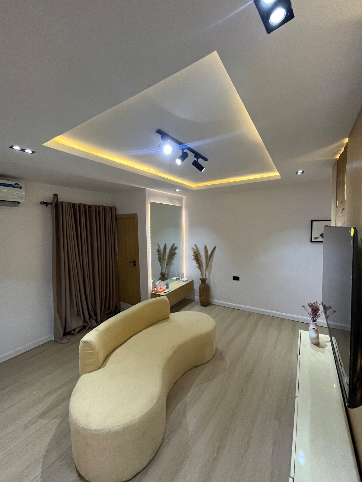 MODERN CHIC APARTMENT WITH UNIQUE DESIGN AND SMART COMFORT. Step into a stylishly curated apartment where modern design meets cozy comfort. 📺 Enjoy your evening with a large smart Tv for Netflix and chills. Stay connected with high-speed WiFi and enjoy 24/7 power backup for uninterrupted comfort. 🌿 Thoughtful touches like decorative lighting, indoor plants, and artistic wall décor create a calming, homey vibe. Ginger bird is a home away from home.